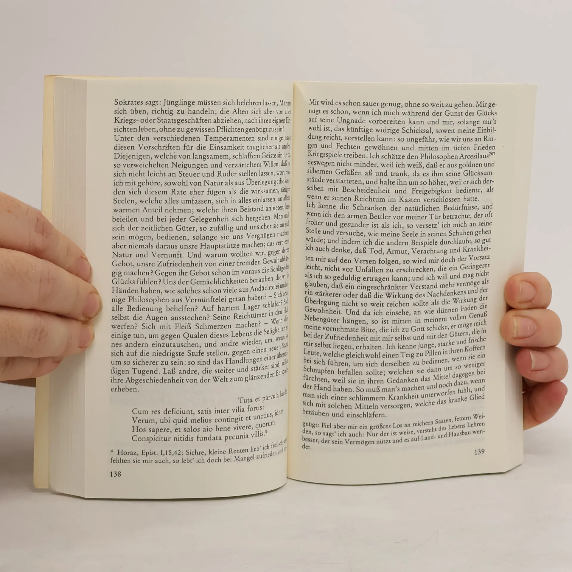 "Wir halten den Tod, die Armut und körperliche Schmerzen für unsre hauptsächlichsten Feinde. Wer weiß aber nicht, daß dieser Tod, den einige das Schrecklichste aller Schrecknisse nennen, von andern der einzige Hafen gegen die Stürme dieses Lebens, das höchste Gut der Natur, die einzige Stütze unsrer 7 Freiheit, das allgemeine und schnelle Heilmittel gegen alle Übel genannt wird? Und daß, so wie etliche mit Zittern und Zagen an ihn denken, andre ihn leichter ertragen als das Leben?" Gröls-Verlag (Edition Werke der Weltliteratur)