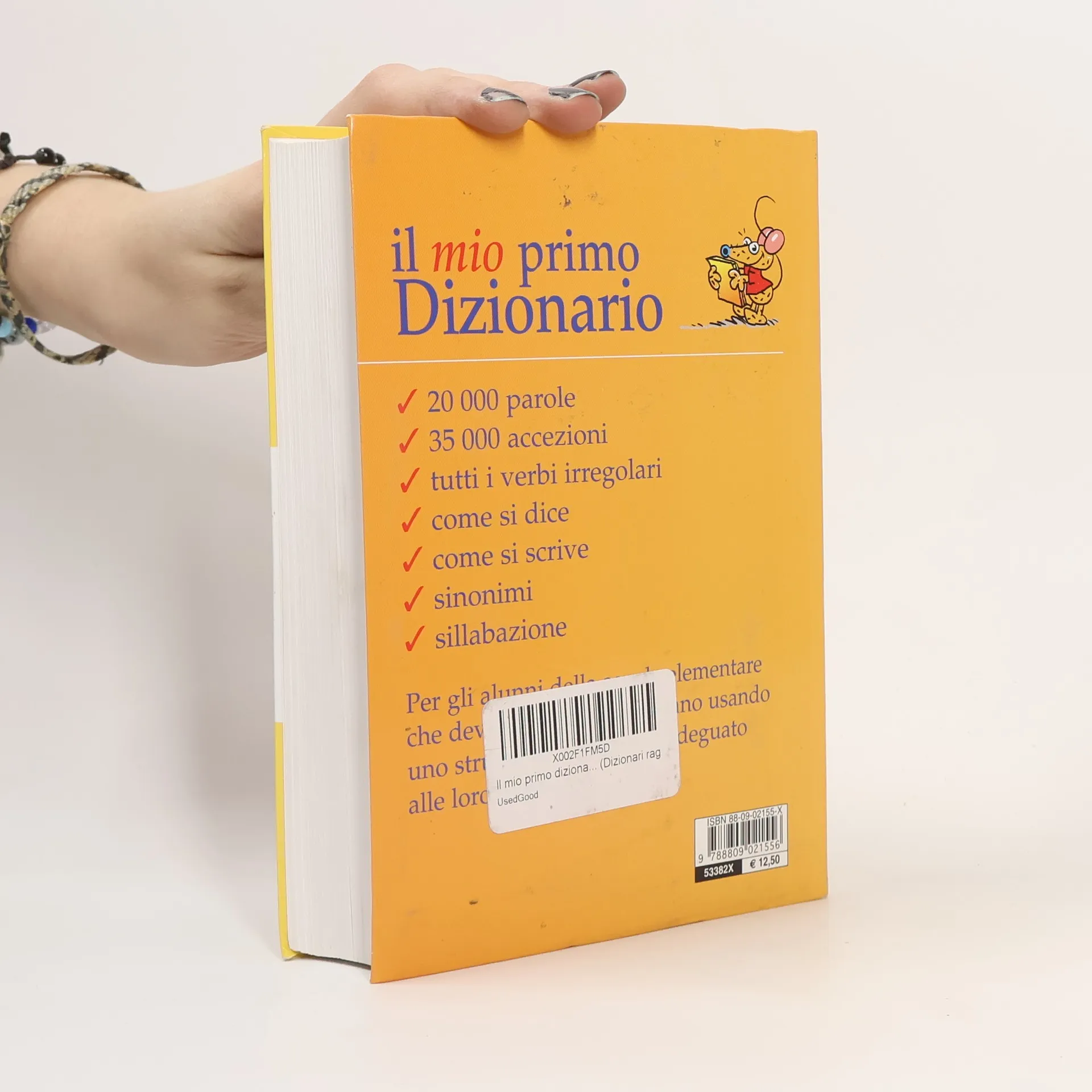 Il mio primo dizionario è rivolto agli alunni della scuola elementare che devono imparare l'italiano usando uno strumento semplice e adeguato alle loro esigenze. Il significato di tutti i vocaboli e gli usi linguistici più diffusi della lingua comune sono spiegati con un linguaggio semplice ma preciso. L'ampio numero di parole contenute fa di questo dizionario uno strumento adatto a soddisfare i bisogni dell'intero ciclo della scuola elementare. In questo dizionario 20.000 parole con i relativi significati, 35.000 accezioni, un'appendice con tutti i verbi irregolari, sinonimi, sillabazione e la sezione del "Come si dice", "Come si scrive", "Parole dell'informatica e di Internet". Età di da 6 anni.