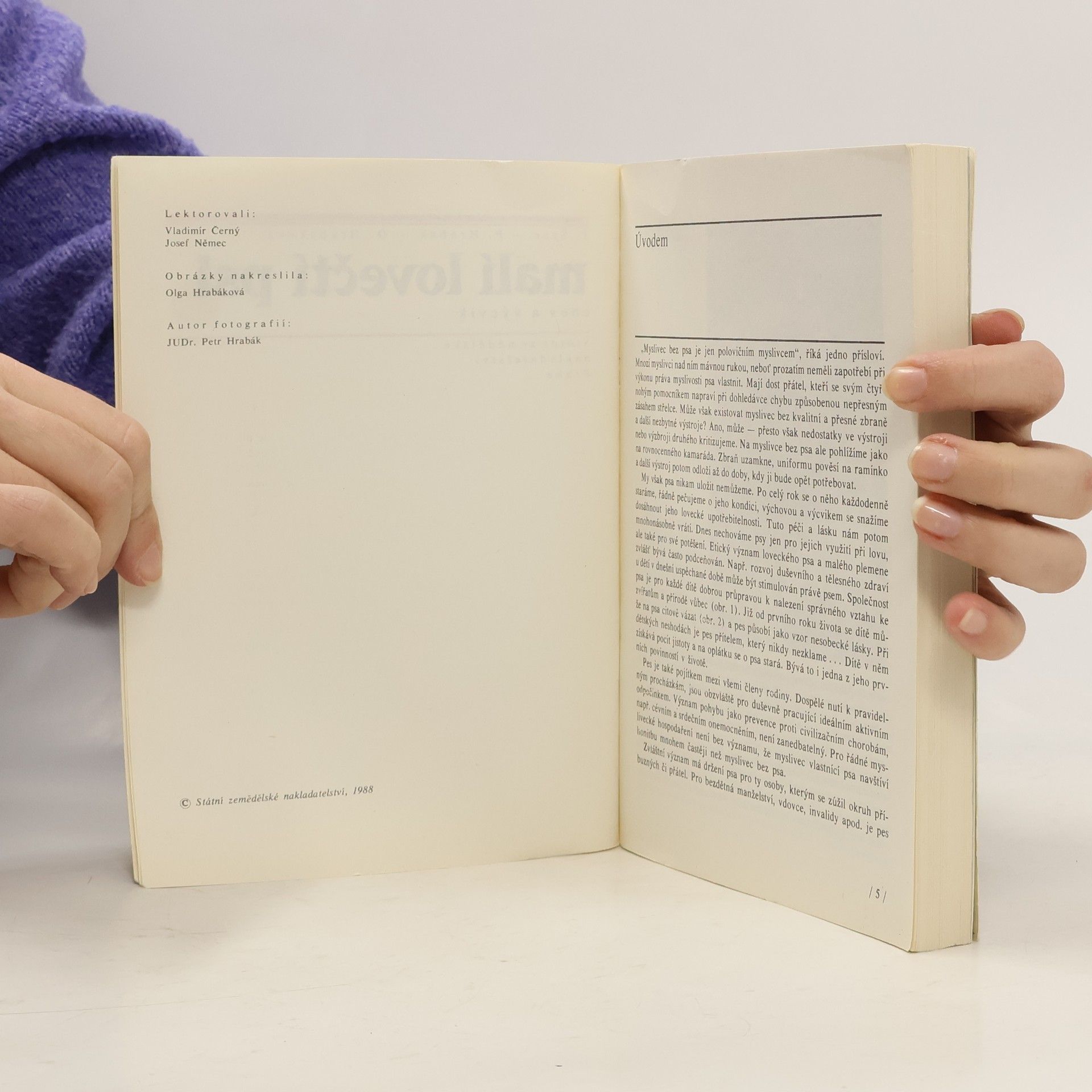Majitelům, chovatelům a cvičitelům se dostává do rukou praktická příručka o chovu a výcviku jezevčíků, teriérů, loveckých slídičů a honičů. Poučí se nejen o zásadách péče, úpravy a výživy těchto psů, o jejich výcviku, chovu a využití, ale seznámí se i s výběrem a výchovouštěňat a s právními aspekty držení psa. Autoři nezapomínají ani na zkoušky a soutěže malých loveckých psů. Lektorovali: Vladimír Černý, Josef Němec. Obrázky nakreslila: Olga Hrabáková. Autor fotografií: JUDr. Petr Hrabák. Obálku navrhl s použitím barevných diapozitivů JUDr. Petra Hrabáka Milan Pašek. Vydání první. 296 stran, 13 tabulek, 112 černobílých obrázků, 40 barevných obrázků. Vydalo SZN v Praze roku 1988 ve sbírce Lesnictví, myslivost a vodní hospodářství.