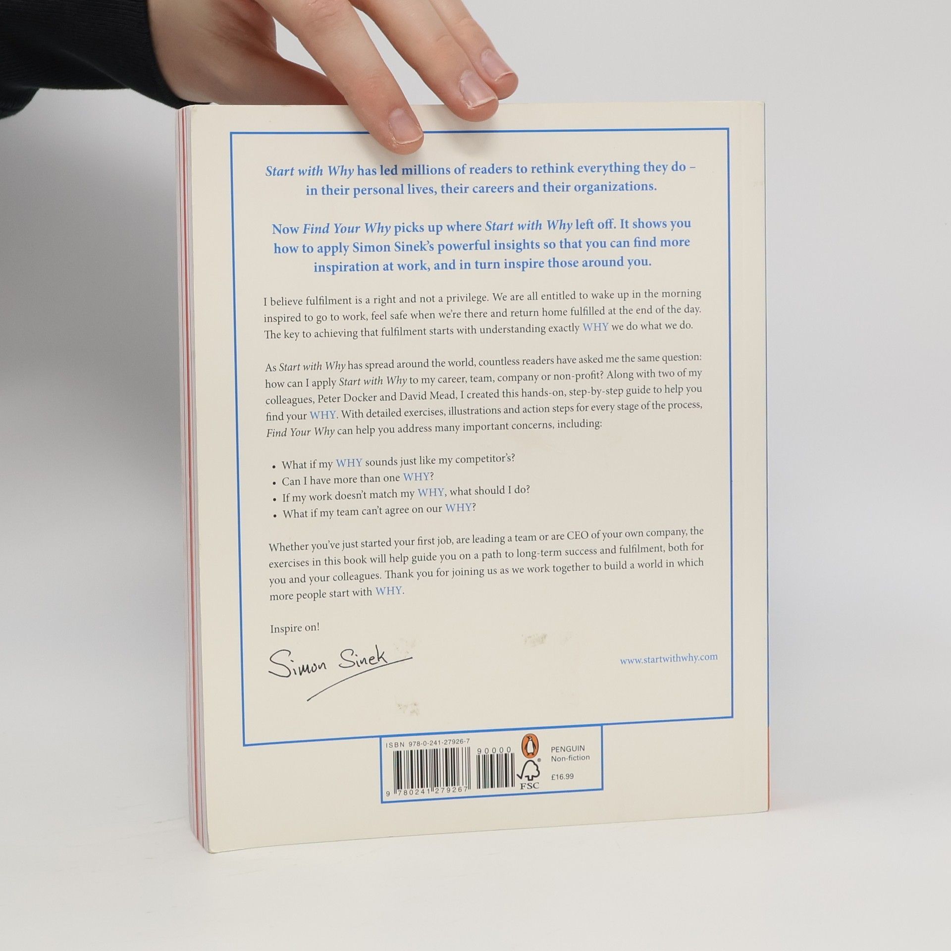 Simon Sinek's recent video on 'The Millennial Question' went viral with over 150 million views. Find Your Why is the follow up to Start with Why, the global bestseller and the subject of the third most watched TED Talk of all time. With Start With Why, Simon Sinek inspired a movement to build a world in which the vast majority of us can feel safe while we are at work and fulfilled when we go home at night. Now, along with two of his colleagues, Peter Docker and David Mead, Sinek has created a guide to the most important step any business can take- finding your why. This easy-to-follow guide starts with the search for your personal why, and then expands to helping your colleagues find your organization's why. With detailed instructions on every stage in the process, the book also answer common concerns, such as- What if my why sounds like my competitor's? Can you have more than one why? And, if my work doesn't match my why, what do I do? Whether you're entry level or a CEO, whether your team is run by the founder or a recent hire, these simple steps will lead you on a path to a more fulfilling life and long-term success for you and your colleagues.