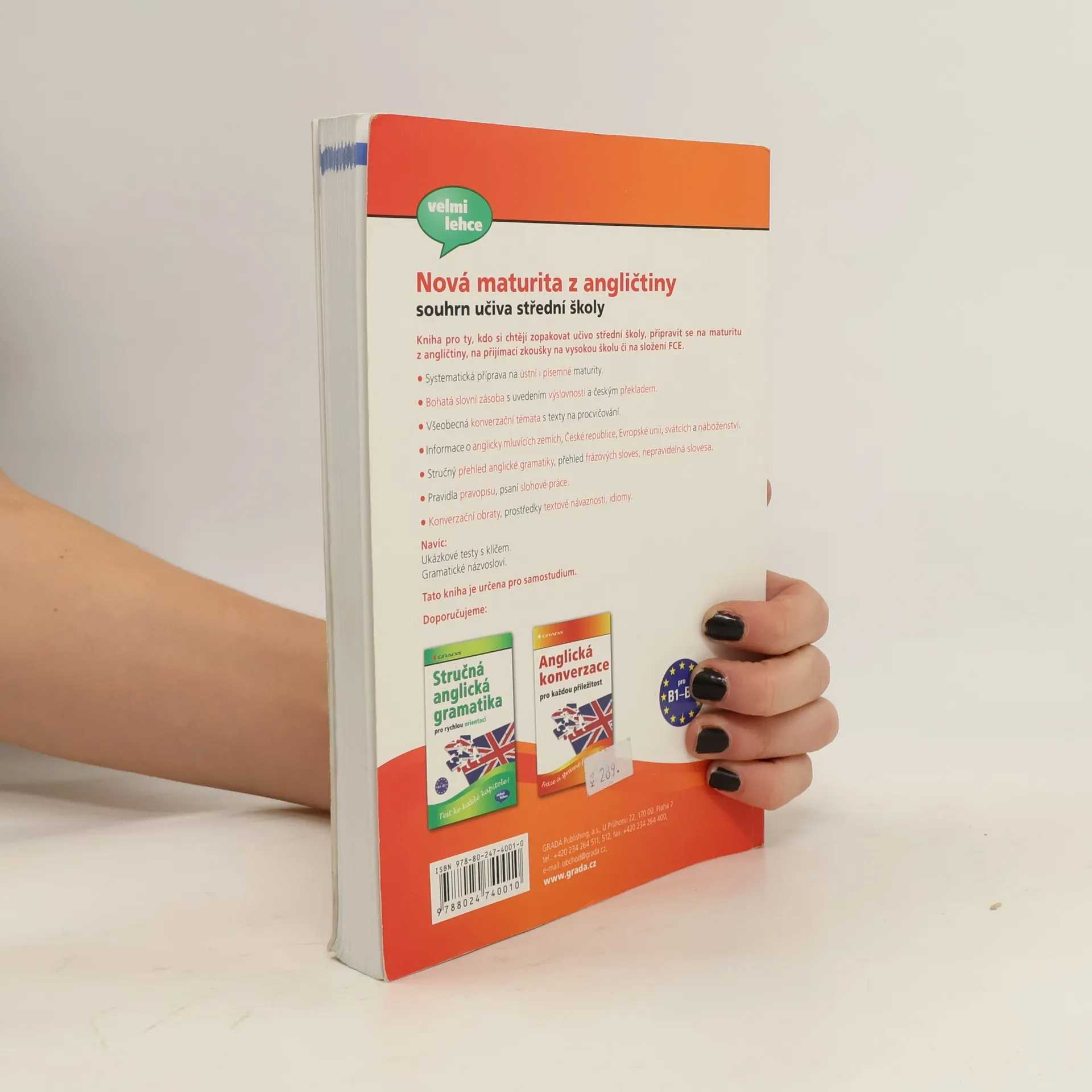 Kniha pro ty, kdo si chtějí zopakovat učivo střední školy, připravit se na maturitu z angličtiny, na přijímací zkoušky na vysokou školu či na složení FCE. Je zde systematická příprava na ústní i písemné maturity, bohatá slovní zásoba s uvedením výslovnosti a českým překladem, všeobecná konverzační témata s texty na procvičování, informace o anglicky mluvících zemích, České republice, Evropské unii, svátcích a náboženství. V další části knihy najdete stručný přehled anglické gramatiky, přehled frázových sloves, nepravidelná slovesa, pravidla pravopisu, psaní slohové práce, konverzační obraty, prostředky textové návaznosti a idiomy. Text doplňují ukázkové maturitní testy s klíčem a gramatické názvosloví. Tato kniha je určena pro samostudium. Autorka učí angličtinu na střední škole.
