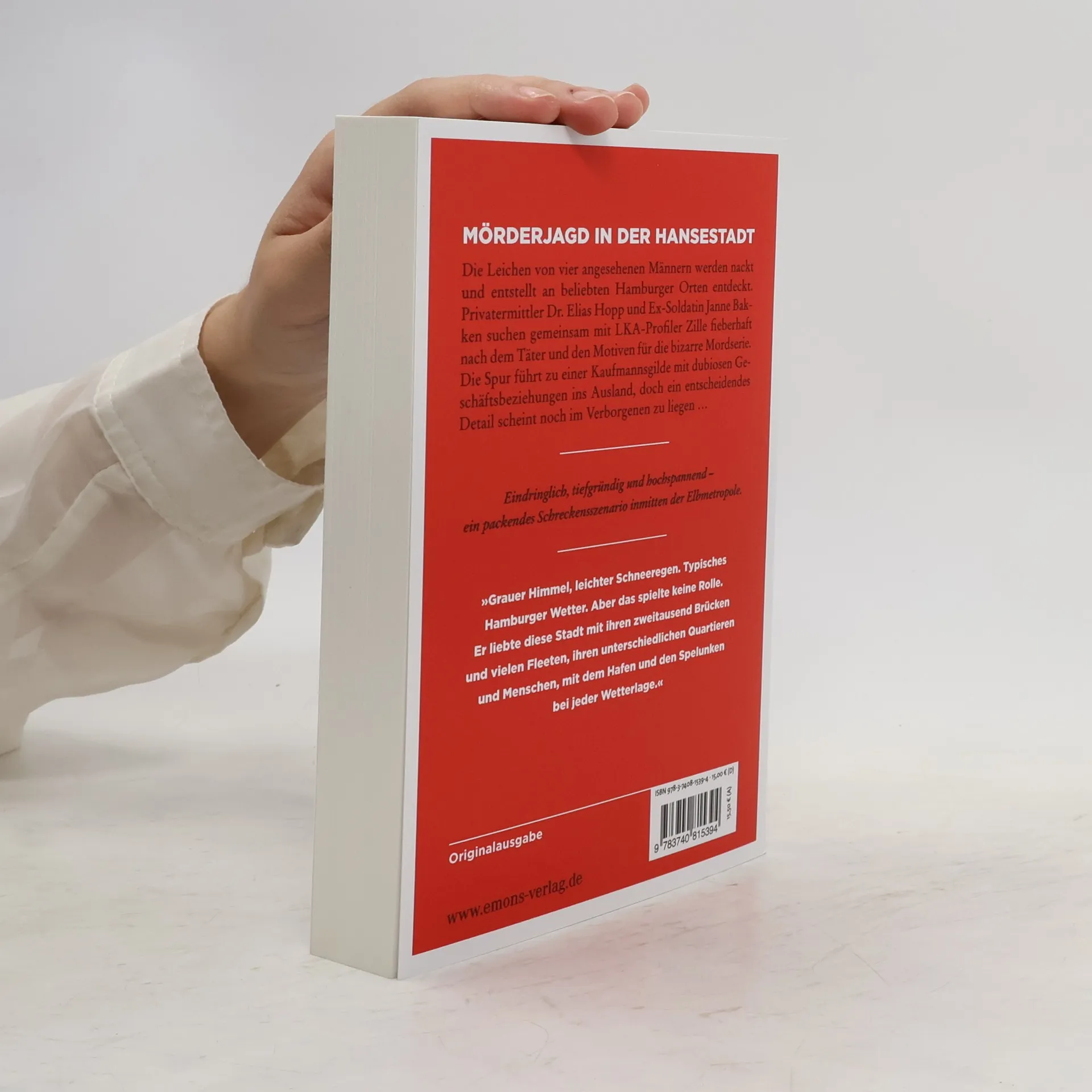 Serienmorde in der Hansestadt Die Leichen von vier angesehenen Männern werden nackt und entstellt an beliebten Hamburger Orten entdeckt. Privatermittler Dr. Elias Hopp und Ex-Soldatin Janne Bakken suchen gemeinsam mit LKA-Profiler Zille fieberhaft nach dem Täter und den Motiven für die bizarre Mordserie. Die Spur führt zu einer Kaufmannsgilde mit dubiosen Geschäftsbeziehungen ins Ausland, doch ein entscheidendes Detail scheint noch im Verborgenen zu liegen …
