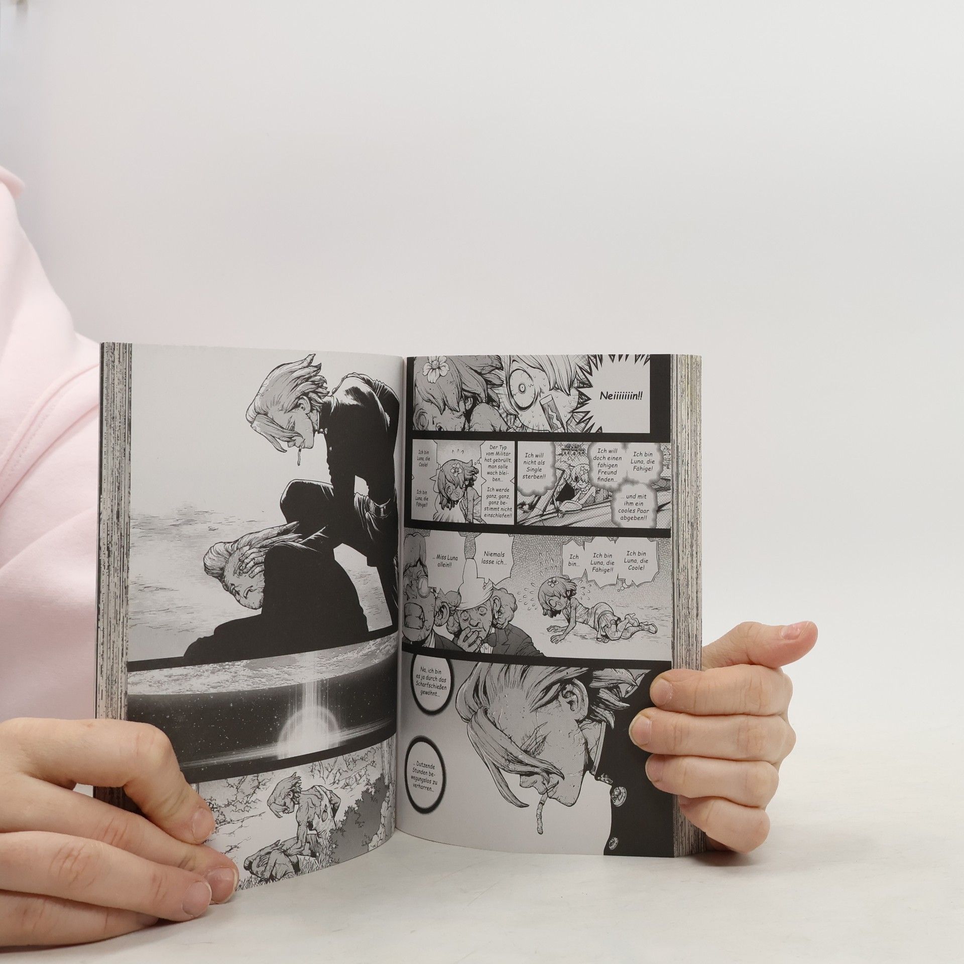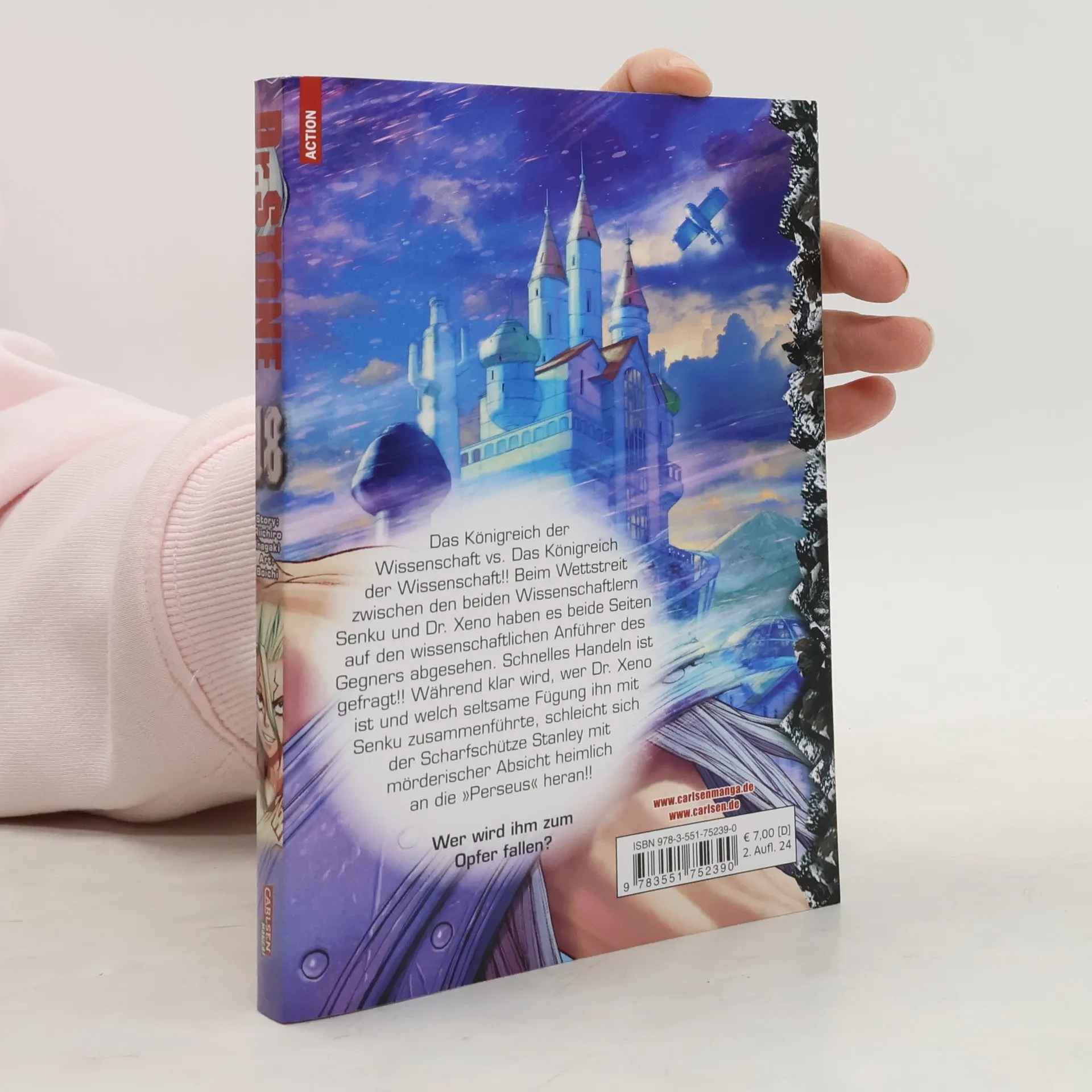 DR. STONE ist einer der beliebtesten Manga in Japan und begeistert mittlerweile auch Animefans auf der ganzen Welt! Ein Augenblick, und die Menschheit erstarrt auf mysteriöse Weise zu Stein. Als die beiden Highschool-Schüler Senku und Taiju mehr als dreitausend Jahre später erwachen, beschließen sie, die menschliche Zivilisation im Alleingang neu aufzubauen! Ein beispielloses Science-Fiction-Abenteuer beginnt! Das erwartet dich in diesem Band: Das Königreich der Wissenschaft vs. Das Königreich der Wissenschaft!! Beim Wettstreit zwischen den beiden Wissenschaftlern Senku und Dr. Xeno haben es beide Seiten auf den wissenschaftlichen Anführer des Gegners abgesehen. Schnelles Handeln ist gefragt!! Während klar wird, wer Dr. Xeno ist und welch seltsame Fügung ihn mit Senku zusammenführte, schleicht sich der Scharfschütze Stanley mit mörderischer Absicht heimlich an die »Perseus« heran!! Abenteuer, Action, Witz und Wissenschaft vereinen sich in diesem Manga für Jungs, Mädchen und alle Geschlechter. Und das Beste: Physik und Chemie sind hier ein Riesenspaß! Weitere Informationen: - Abgeschlossen in 26 Bänden - Top Titel der japanischen WEEKLY SHONEN JUMP - Perfekt für alle Mangafans ab 14 Jahren