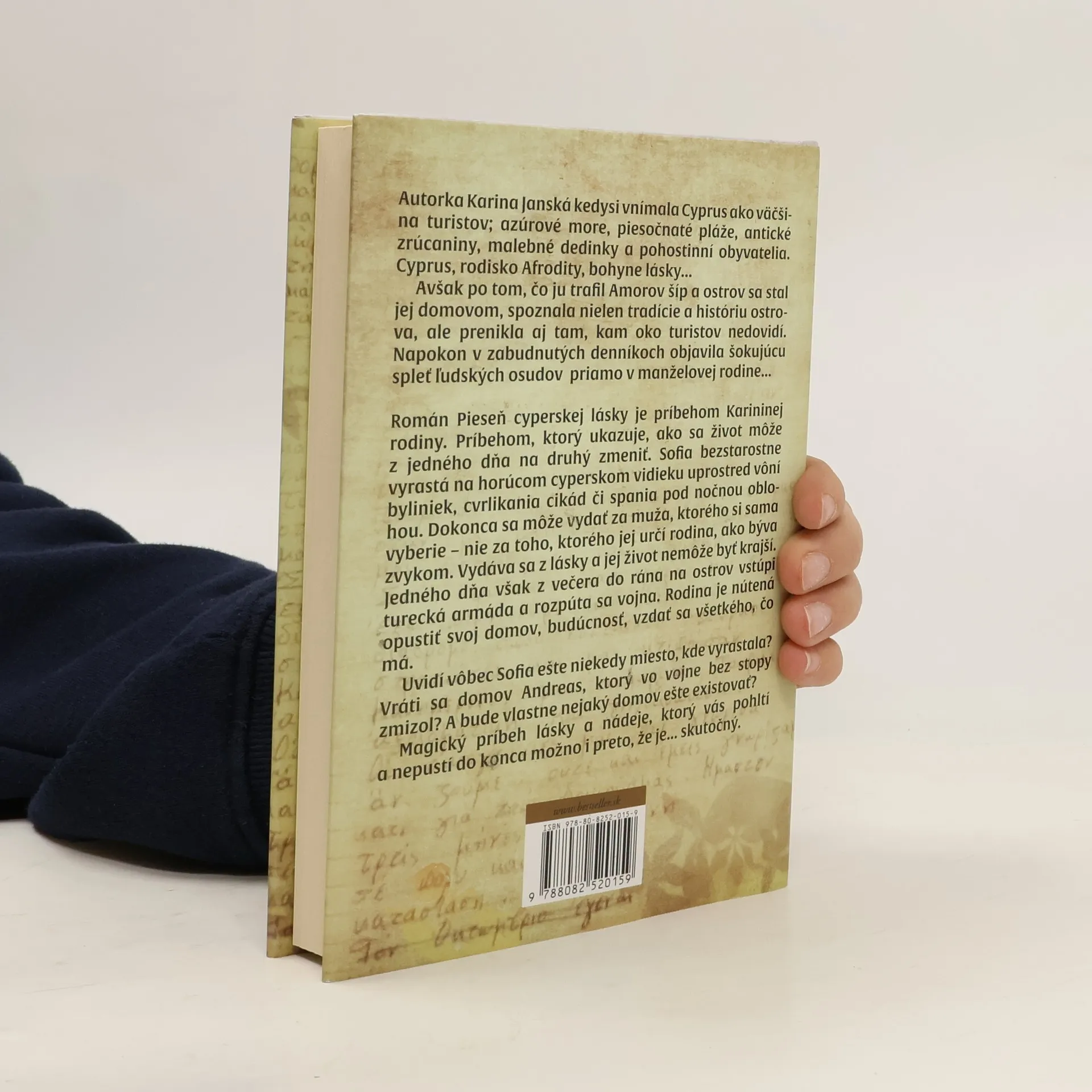 Autorka Karina Janská kedysi vnímala Cyprus ako väčšina turistov; azúrové more, piesočnaté pláže, antické zrúcaniny, malebné dedinky a pohostinní obyvatelia. Cyprus, rodisko Afrodity, bohyne lásky... Avšak po tom, čo ju trafil Amorov šíp a ostrov sa stal jej domovom, spoznala nielen tradície a históriu ostrova, ale prenikla aj tam, kam oko turistov nedovidí. Napokon v zabudnutých denníkoch objavila šokujúcu spleť ľudských osudov priamo v manželovej rodine... Román Pieseň cyperskej lásky je príbehom Karininej rodiny. Príbehom, ktorý ukazuje, ako sa život môže z jedného dňa na druhý zmeniť. Sofia bezstarostne vyrastá na horúcom cyperskom vidieku uprostred vôní byliniek, cvrlikania cikád či spania pod nočnou oblohou. Dokonca sa môže vydať za muža, ktorého si sama vyberie - nie za toho, ktorého jej určí rodina, ako býva zvykom. Vydáva sa z lásky a jej život nemôže byť krajší. Jedného dňa však z večera do rána na ostrov vstúpi turecká armáda a rozpúta sa vojna. Rodina je nútená opustiť svoj domov, budúcnosť, vzdať sa všetkého, čo má. Uvidí vôbec Sofia ešte niekedy miesto, kde vyrastala? Vráti sa domov Andreas, ktorý vo vojne bez stopy zmizol? A bude vlastne nejaký domov ešte existovať? Magický príbeh lásky a nádeje, ktorý vás pohltí a nepustí do konca možno i preto, že je... skutočný.