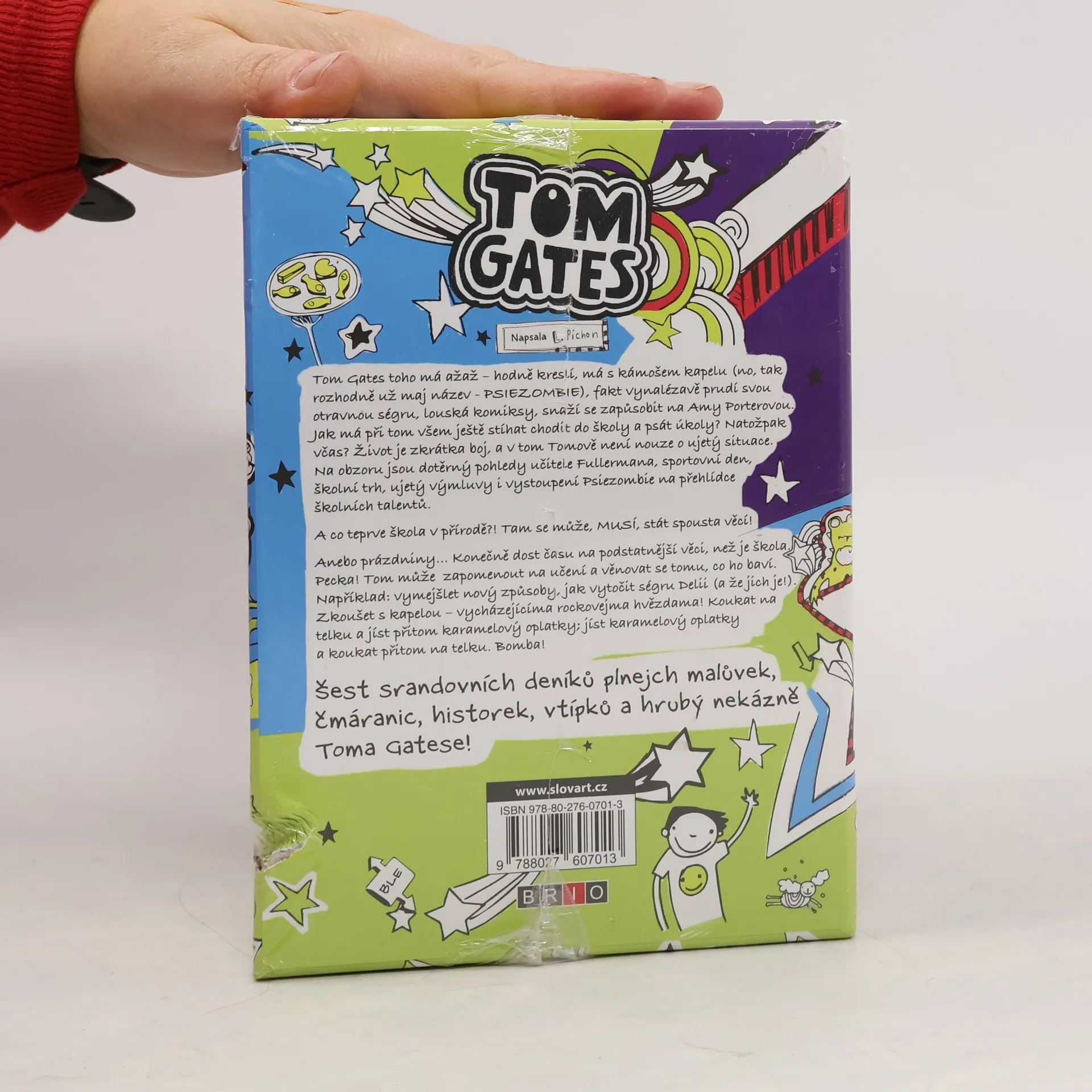 Šest srandovních deníků plnejch malůvek, čmáranic, historek, vtípků a hrubý nekázně Toma Gatese! Tom Gates toho má ažaž – hodně kreslí, má s kámošem kapelu (no, tak rozhodně už maj název - PSIEZOMBIE), fakt vynalézavě prudí svou otravnou ségru, louská komiksy, snaží se zapůsobit na Amy Porterovou... Jak má při tom všem ještě stíhat chodit do školy a psát úkoly? Natožpak včas? Život je zkrátka boj, a v tom Tomově není nouze o ujetý situace. Na obzoru jsou dotěrný pohledy učitele Fullermana, sportovní den, školní trh, ujetý výmluvy i vystoupení Psiezombiů na přehlídce školních talentů. A co teprve škola v přírodě?! Tam se může, MUSÍ, stát spousta věcí! Anebo prázdniny… Konečně dost času na podstatnější věci, než je škola. Pecka! Tom může zapomenout na učení a věnovat se tomu, co ho baví. Například: vymejšlet nový způsoby, jak vytočit ségru Delii (a že jich je!). Zkoušet s kapelou – vycházejícíma rockovejma hvězdama! Koukat na telku a jíst přitom karamelový oplatky; jíst karamelový oplatky a koukat přitom na telku. Bomba!