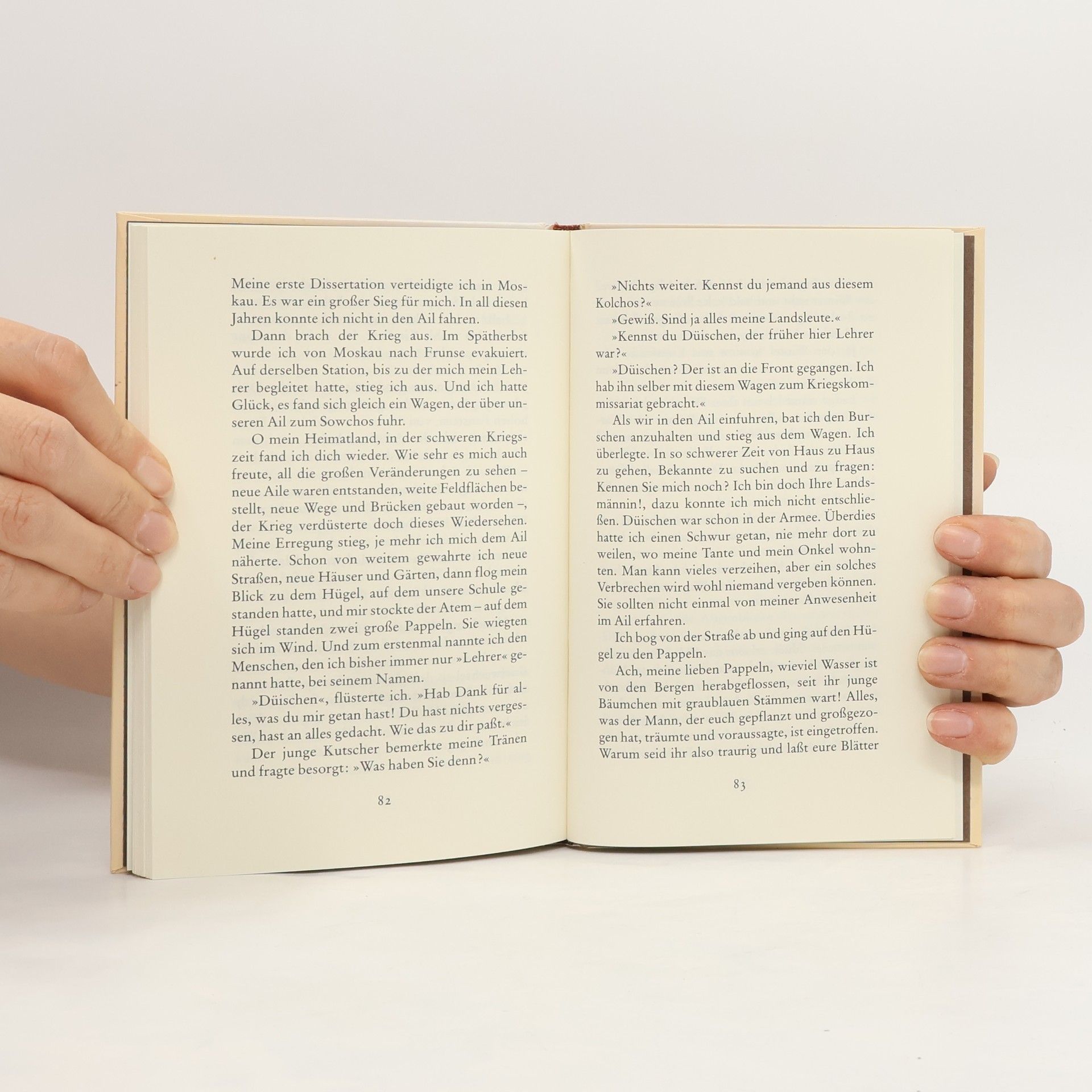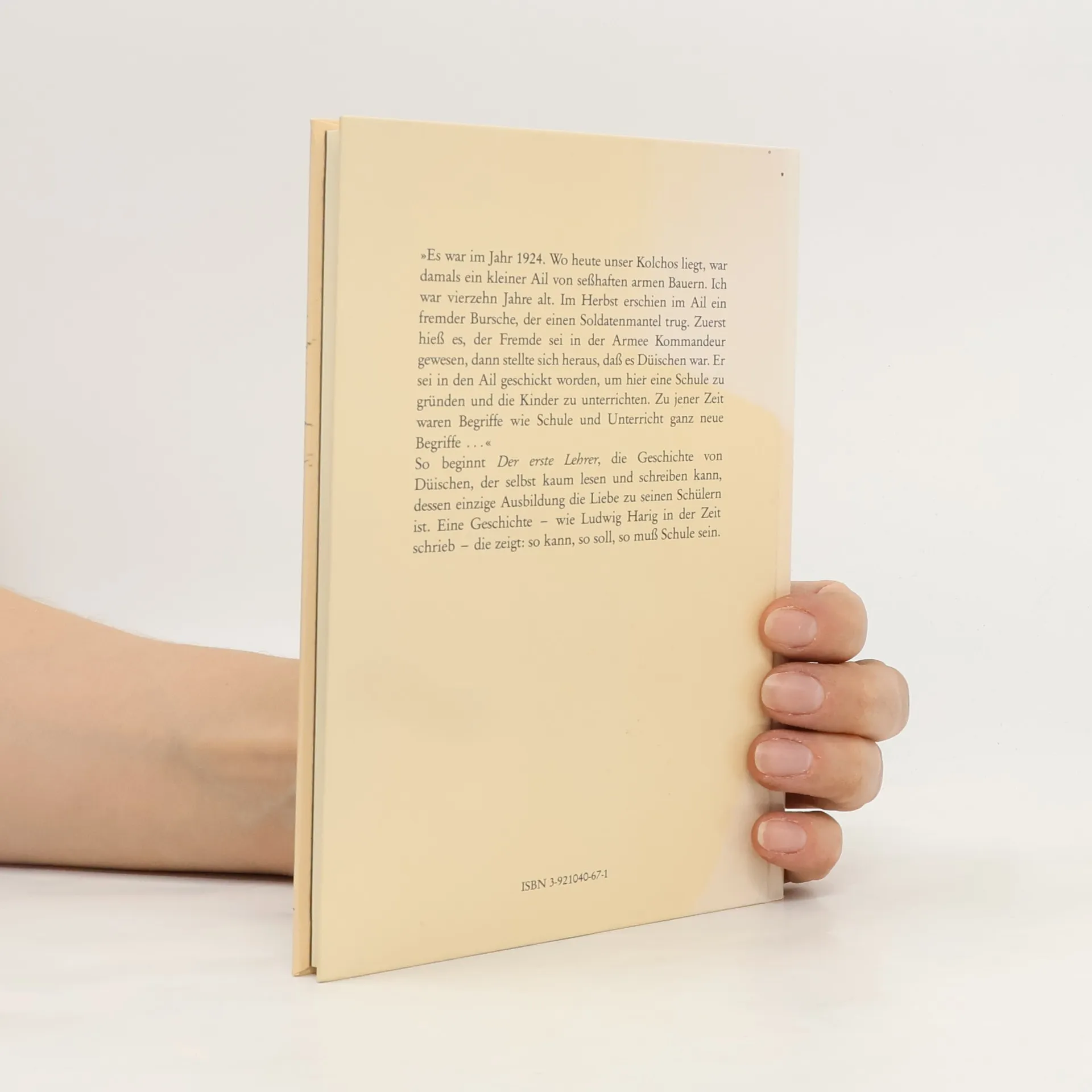"Es war im Jahr 1924. Wo heute unser Kolchos liegt, war damals ein kleiner Ail von seßhaften armen Bauern. Ich war vierzehn Jahre alt. Im Herbst erschien im Ail ein fremder Bursche, der einen Soldatenmantel trug. Zuerst hieß es, der Fremde sei in der Armee Kommandeur gewesen, dann stellte sich heraus, dass es Düischen war. Er sein in den AIk geschickt worden, um hier eine Schule zuu gründen und die Kinder zu unterrichten. Zu jener Zeit waren Worte wie Schule und Unterricht ganz neue Begriffe..." So beginnt "Der erste Lehrer", die Geschichte von Düischen, der selbst kaum lesen und schreiben kann, dessen einzige Ausbildung die Liebe zu seinen Schülern ist und der ihnen mit allem, was er weiß, die Welt erschließen will. Eine Geschichte, die - wie Ludwig Harig in denr ZEIT schrieb - zeigt: so kann, so soll, so muss Schule sein.