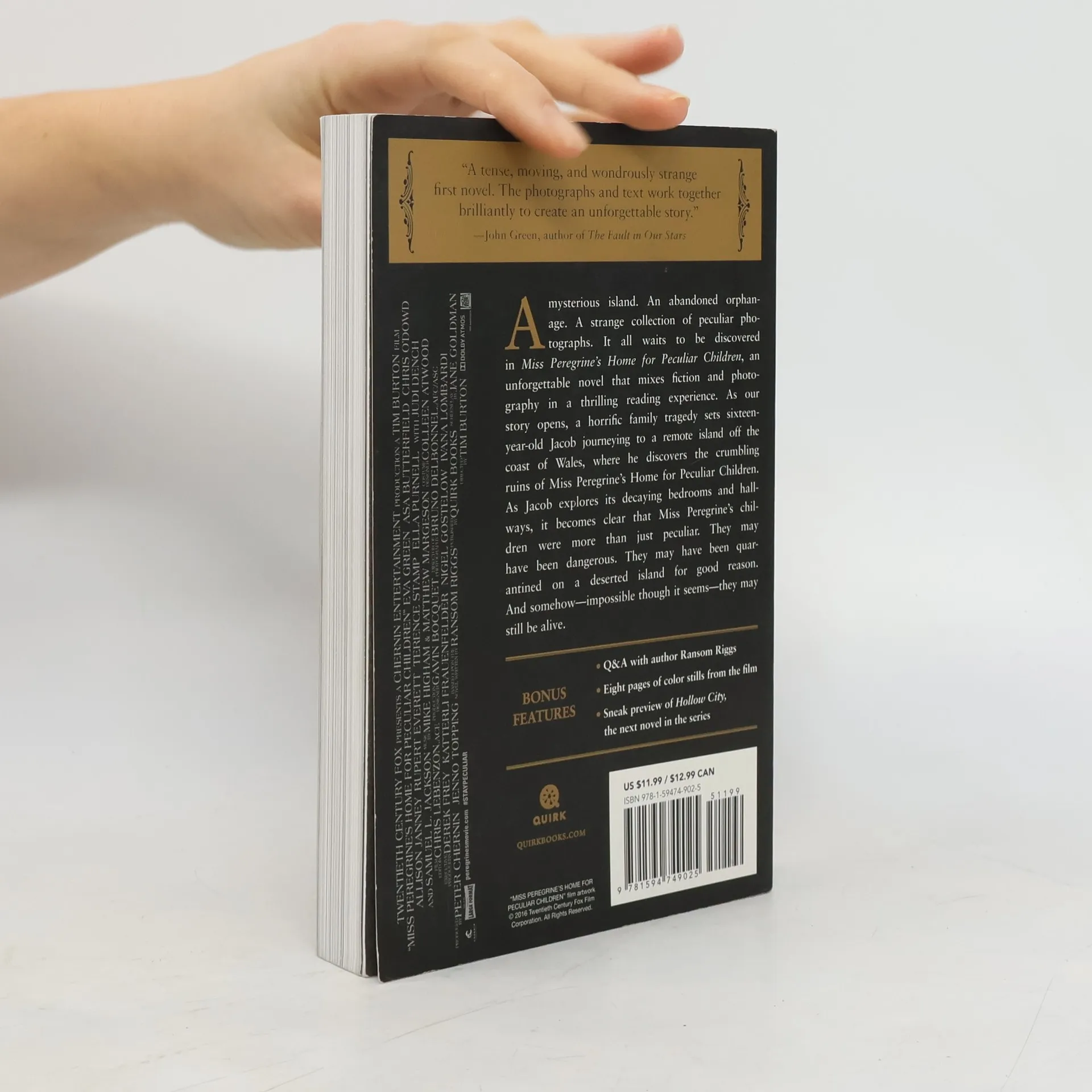 The #1 New York Times best-selling series. Bonus features • Q&A with author Ransom Riggs • Eight pages of color stills from the film • Sneak preview of Hollow City, the next novel in the series A mysterious island. An abandoned orphanage. A strange collection of peculiar photographs. It all waits to be discovered in Miss Peregrine’s Home for Peculiar Children, an unforgettable novel that mixes fiction and photography in a thrilling reading experience. As our story opens, a horrific family tragedy sets sixteen year-old Jacob journeying to a remote island off the coast of Wales, where he discovers the crumbling ruins of Miss Peregrine’s Home for Peculiar Children. As Jacob explores its decaying bedrooms and hallways, it becomes clear that Miss Peregrine’s children were more than just peculiar. They may have been dangerous. They may have been quarantined on a deserted island for good reason. And somehow—impossible though it seems—they may still be alive.