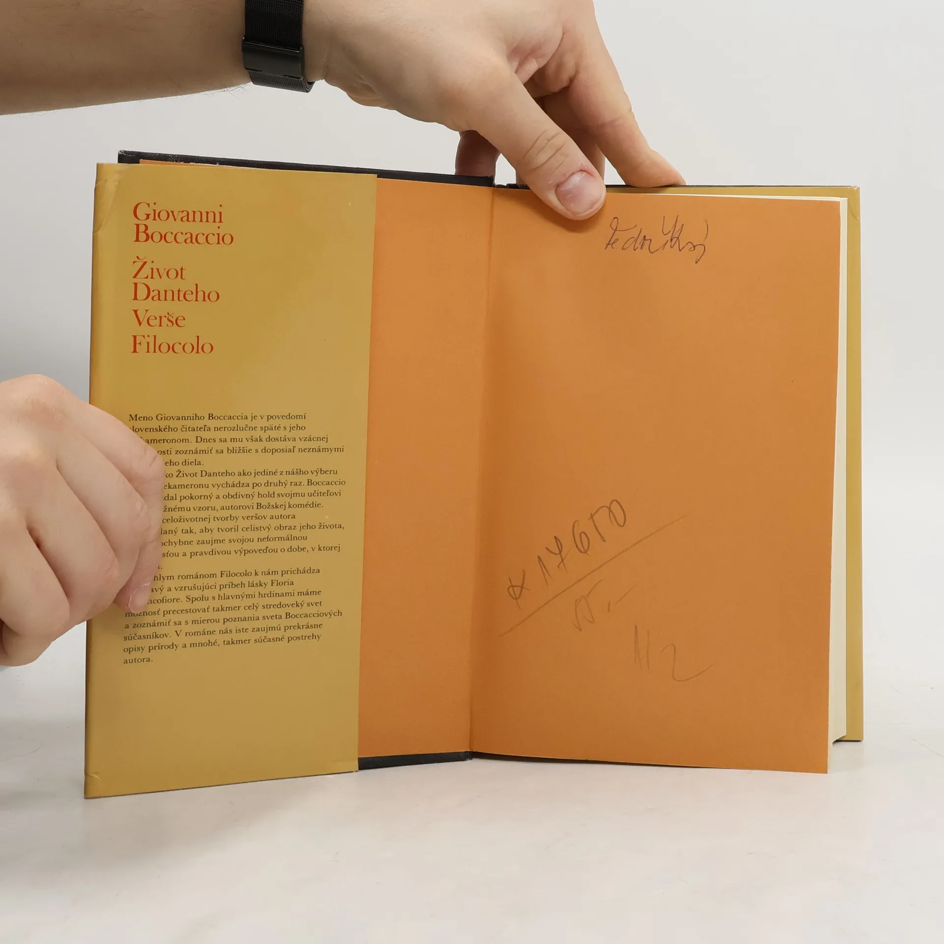 V dielku Život Danteho Boccaccio vzdal pokorný a obdivný hold svojmu učiteľovi a nedostižnému vzoru, autorovi Božskej komédie. Verše – výber z celoživotnej tvorby veršov autora, je usporiadaný tak, aby tvoril celistvý obraz jeho života. Zaujme svojou neformálnou úprimnosťou a pravdivou výpoveďou o dobe, v ktorej autor žil. Román Filocolo – napínavý a vzrušujúci príbeh láskz Floria a Biancofiore, spolu s hlavnými hrdinami máme možnosť precestovať takmer celý stredoveký svet a zoznámiť sa s mierou poznamia sveta Boccacciových súčastníkov.
