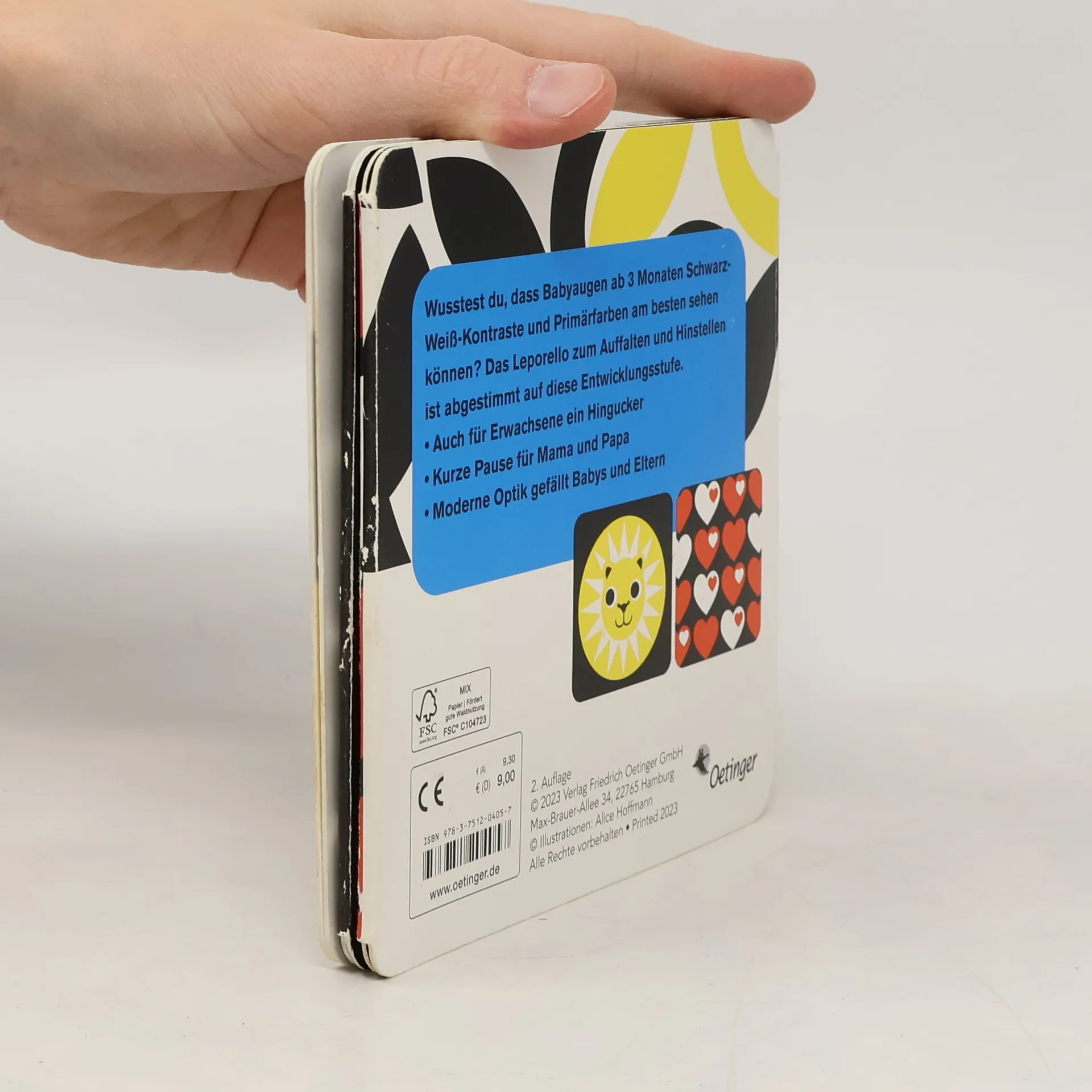 Ein Farbspektakel für Babys. Wusstest du, dass Babys ab drei Monaten neben Schwarz-Weiß-Kontrasten auch Primärfarben gut erkennen können? Dieses Leporello zum Auffalten und Hinstellen ist auch für Erwachsene ein Hingucker. Mit zehn Motiven mit Schwarz, Weiß und den Primärfarben ist es perfekt auf die Sehfähigkeit von Babys ab der zwölften Woche abgestimmt. Alice Hoffmanns Illustrationen bieten Babys eine interessante Beschäftigung und Eltern ein erstes Bilderbuch, das zusammen angeschaut werden kann. Fünf Seiten zeigen unterschiedliche Muster und die anderen fünf Seiten niedliche Tiere. Hier findet jedes Baby garantiert ein Lieblingsmotiv. Eine Augenweide, die nicht nur Babys ab drei Monaten viel Freude bereitet. Kontrastreich illustriertes Leporello mit Bildern, die Babyaugen wahrnehmen können und von den Kleinsten als spannend empfunden werden. Eyecatcher dank Primärfarben: Blau, Rot und Gelb plus Schwarz und Weiß – welches ist deine Lieblingsfarbe? Pappbilderbuch zum Ausklappen und Aufstellen auf dem Wickeltisch, der Spieldecke oder im Kinderzimmer. Moderne, skandinavisch anmutende Optik gefällt Babys und ihren Eltern – auch als Coffeetable Book sehr dekorativ.
