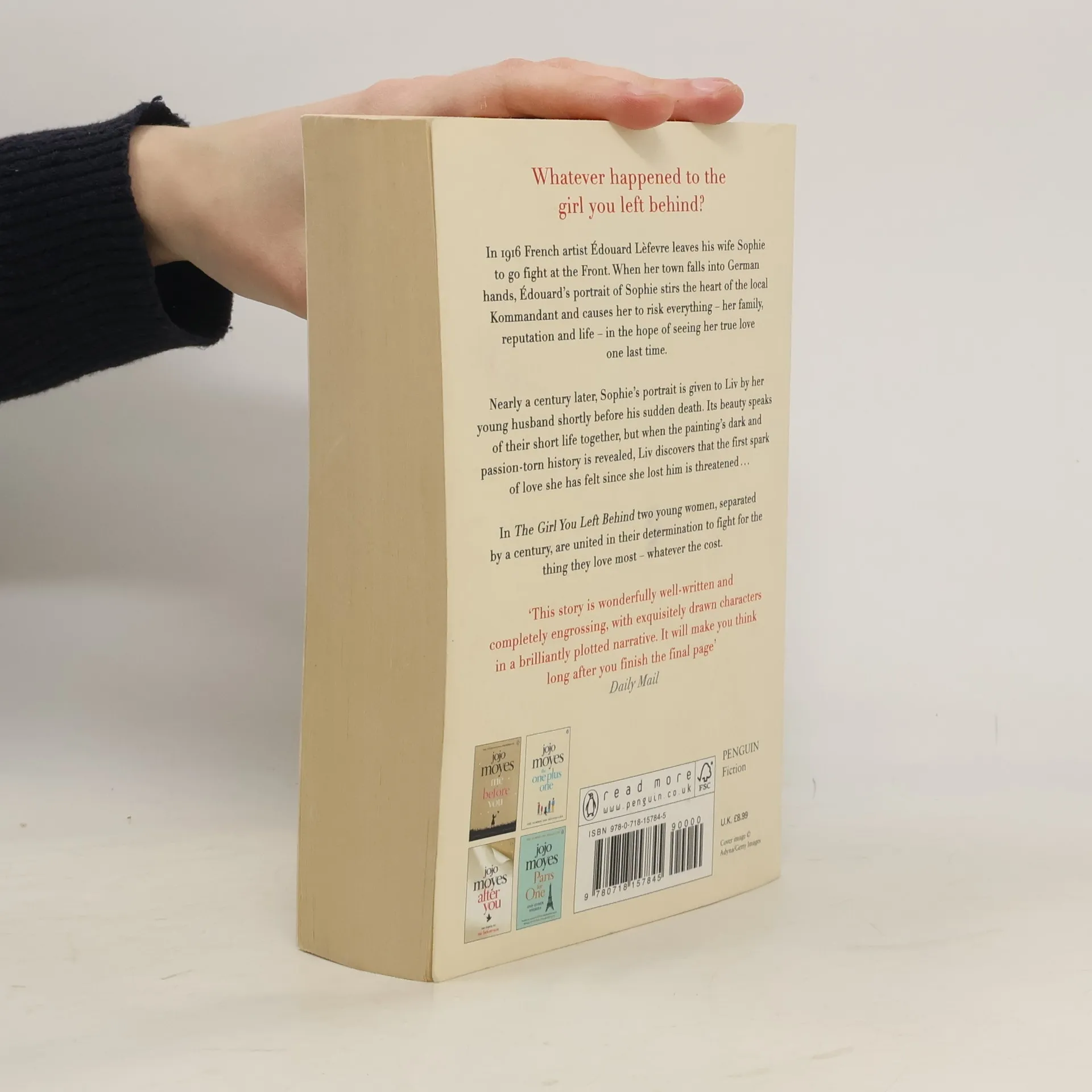 : The Girl You Left Behind is a hauntingly romantic and utterly irresistible new weepy from Jojo Moyes, author of the Richard and Judy bestseller, Me Before You. What happened to the girl you left behind? France, 1916. Sophie Lefevre must keep her family safe whilst her adored husband Edouard fights at the front. When she is ordered to serve the German officers who descend on her hotel each evening, her home becomes riven by fierce tensions. And from the moment the new Kommandant sets eyes on Sophie's portrait - painted by Edouard - a dangerous obsession is born, which will lead Sophie to make a dark and terrible decision. Almost a century later, and Sophie's portrait hangs in the home of Liv Halston, a wedding gift from her young husband before he died. A chance encounter reveals the painting's true worth, and its troubled history.