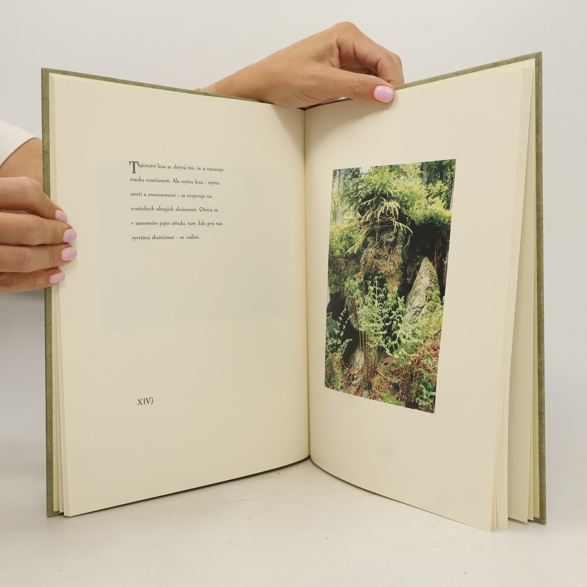 Les a člověk. Les viděný objektivem Petra Hrušky a vztah lesa a člověka, cítěný Michalem Ajvazem. Jedna stránka poetického a filozofujího textu Michala Ajvaze, druhá stránka fotografie detailu lesa Petra Hrušky.