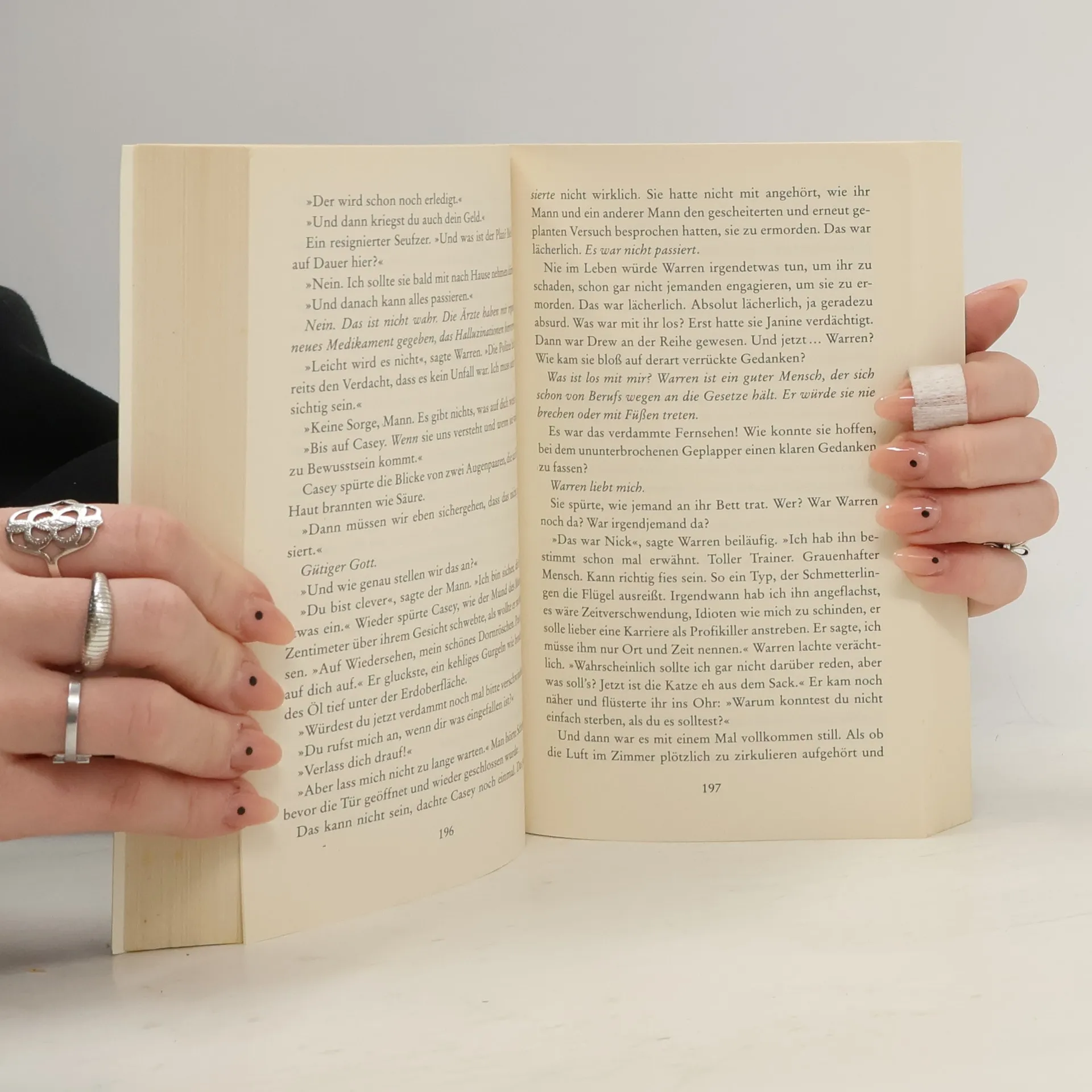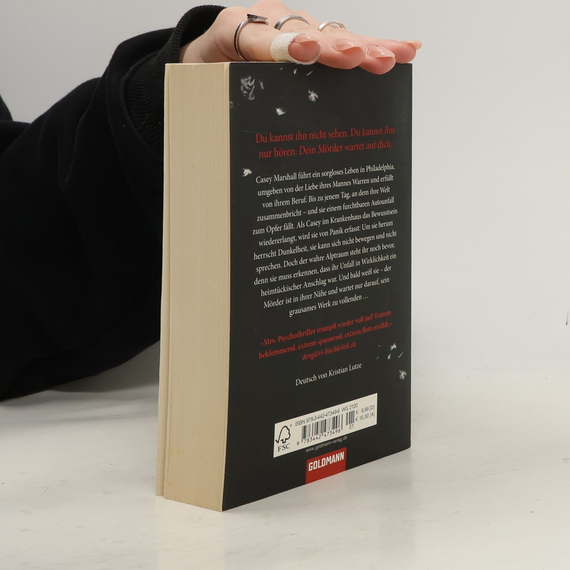 Du kannst ihn nicht sehen. Du kannst ihn nur hören. Dein Mörder wartet auf dich ... Casey Marshall führt ein sorgloses Leben in Philadelphia, umgeben von der Liebe ihres Mannes Warren und erfüllt von ihrem Beruf. Bis zu jenem Tag, an dem ihre Welt zusammenbricht – und sie einem furchtbaren Autounfall zum Opfer fällt. Als Casey im Krankenhaus das Bewusstsein wiedererlangt, wird sie von Panik erfasst: Um sie herum herrscht Dunkelheit, sie kann sich nicht bewegen und nicht sprechen. Doch der wahre Alptraum steht ihr noch bevor, denn sie muss erkennen, dass ihr Unfall in Wirklichkeit ein heimtückischer Anschlag war. Und bald weiß sie – der Mörder ist in ihrer Nähe und wartet nur darauf, sein grausames Werk zu vollenden …