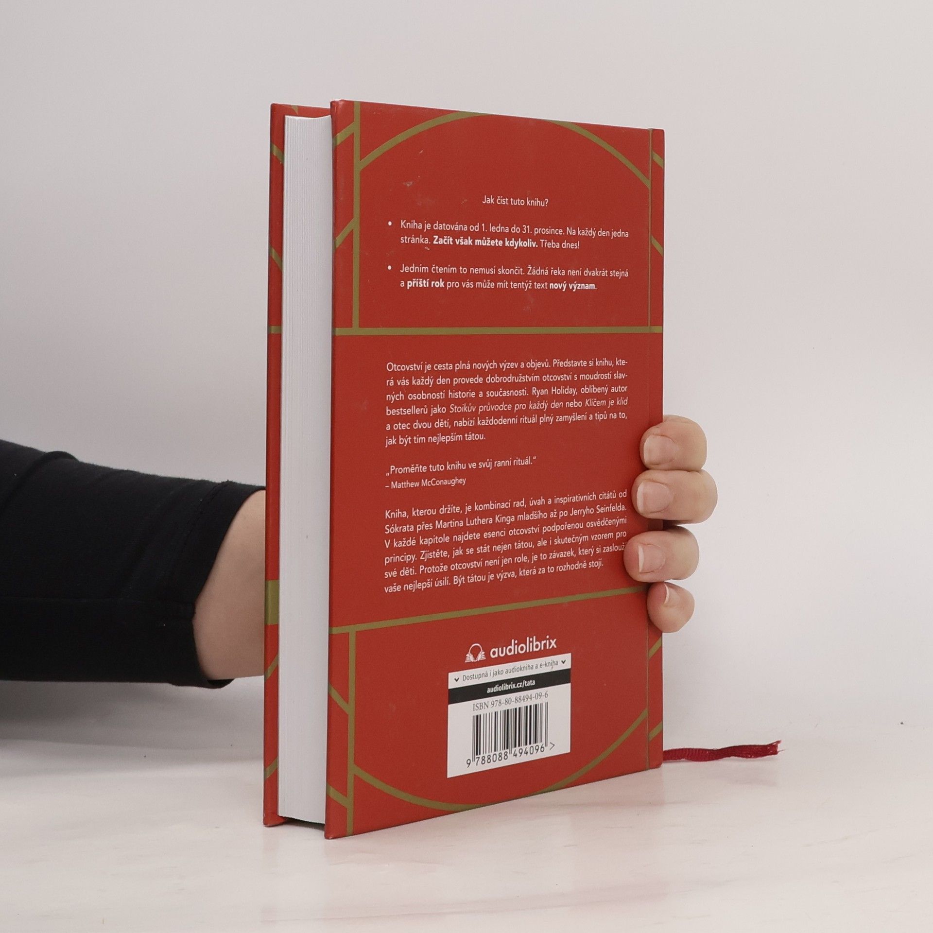 Promyšlená každodenní příručka plná inspirativních citátů a rad od autora bestselleru STOIKŮV PRŮVODCE NA KAŽDÝ DEN - povinná literatura pro každého otce. Co to znamená být skvělým otcem? A jak se jím stát? Rodičovství je role naplněná neuvěřitelným smyslem a účelem, kterou mají muži povinnost brát vážně. Ne každý se však pro tuto roli narodil a i ten, který ano občas potřebuje načerpat trochu inspirace a získat nad situací nadhled. Od autora bestsellerů Ryana Holidaye, který je sám otcem dvou dětí, pomůže tato kniha starým i novým tatínkům najít inspiraci a rady pro každodenní práci, kterou je otcovství. Kromě psychologických výzkumů čerpá také z citátů z historie, popkultury a literatury od Sókrata přes Martina Luthera Kinga mladšího až po Jerryho Seinfelda. Zjistěte, jak se stát nejen tátou, ale i skutečným vzorem pro své děti. Protože otcovství není jen role, je to závazek, který si zaslouží vaše nejlepší úsilí. Být tátou je výzva, která za to rozhodně stojí. „Proměňte tuto knihu ve svůj ranní rituál.“ – Matthew McConaughey