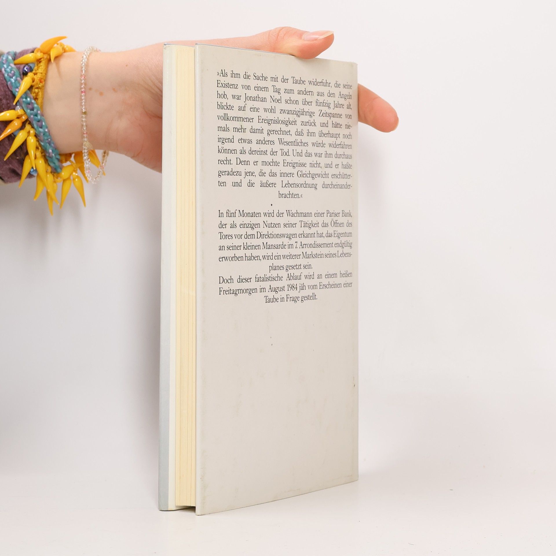 In fünf Monaten wird der Wachmann einer Pariser Bank, der als einzigen Nutzen seiner Tätigkeit das Öffnen des Tores vor dem Direktionswagen erkannt hat, das Eigentum an seiner kleinen Mansarde endgültig erworben haben, wird ein weiterer Markstein seines Lebensplanes gesetzt sein. Doch dieser fatalistische Ablauf wird an einem heißen Freitagmorgen im August 1984 jäh vom Erscheinen einer Taube in Frage gestellt.