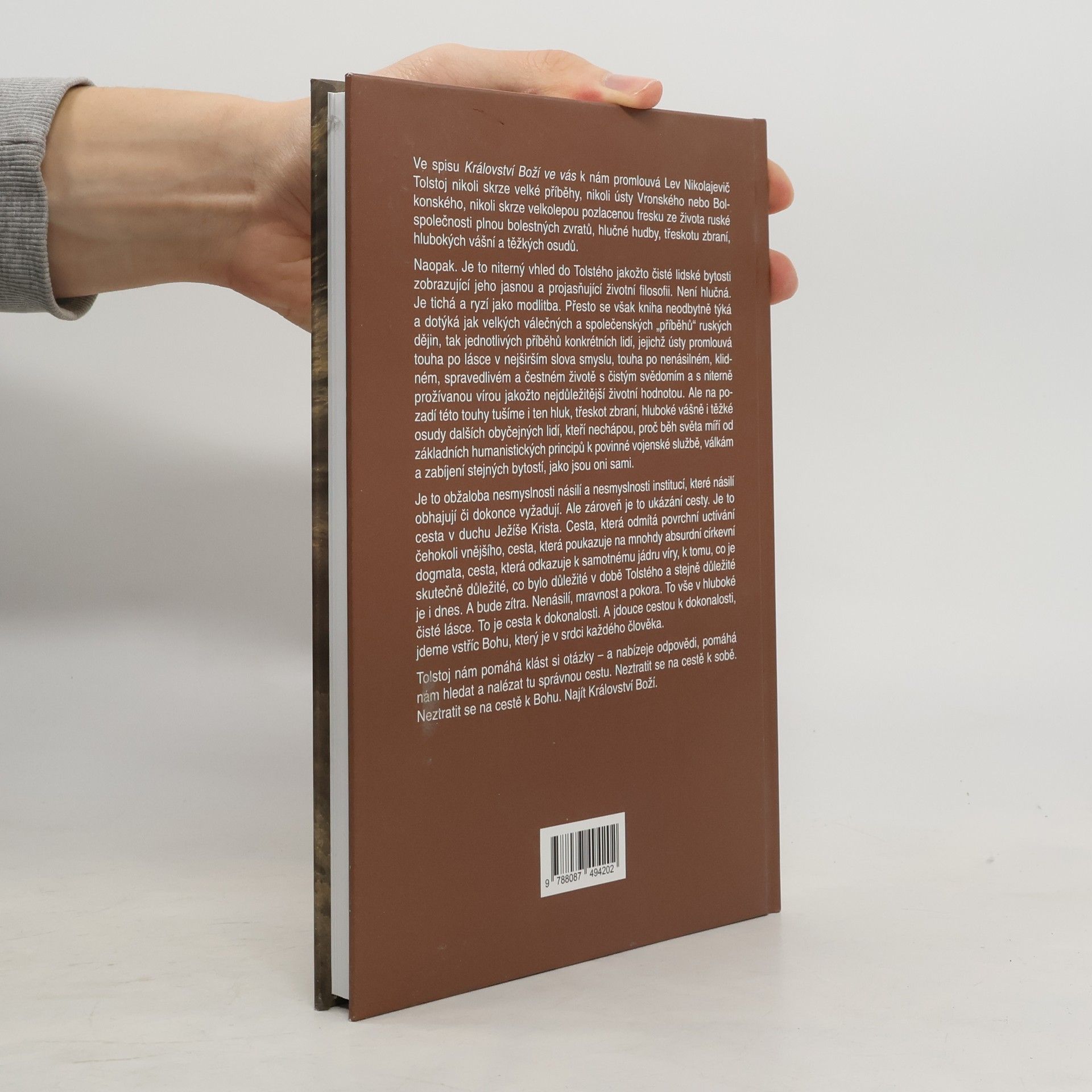 Kniha Království Boží ve vás náleží do spirituální linie Tolstého tvorby, která nabrala sílu a svébytný tón až v posledních dvaceti letech jeho života. Avšak o to vyzráleji a myšlenkově působivěji vyznívá. Vzdálen hluku ruských velkoměst – jak skutečným životem, tak uvažováním – představuje zde Tolstoj své nejniternější přesvědčení a životní filozofii. Promlouvá z ní především touha po lásce v nejširším slova smyslu, touha po nenásilném, klidném, spravedlivém a čestném životě s čistým svědomím a s niterně prožívanou vírou jakožto nejdůležitější životní hodnotou. Ozývá se zde zároveň jednak údiv nad nesmyslným směřováním světa od základních humanistických principů k povinné vojenské službě, válkám a zabíjení lidí, jednak také obžaloba násilí a institucí, které násilí obhajují či dokonce vyžadují. Ale zároveň je tato kniha ukázáním cesty. Cesty v duchu Ježíše Krista. Tato cesta odmítá povrchní uctívání čehokoli vnějšího, poukazuje na mnohdy absurdní církevní dogmata a odkazuje k samotnému jádru víry, k tomu, co je skutečně důležité, co bylo důležité v době Tolstého a stejně důležité je i dnes. Nenásilí, mravnost a pokora. To vše v hluboké čisté lásce. Kniha je výborem z díla podle posledního českého vydání z roku 1925 v překladu Karla Štěpánka, Josefa Bečky a Karla Velemínského.