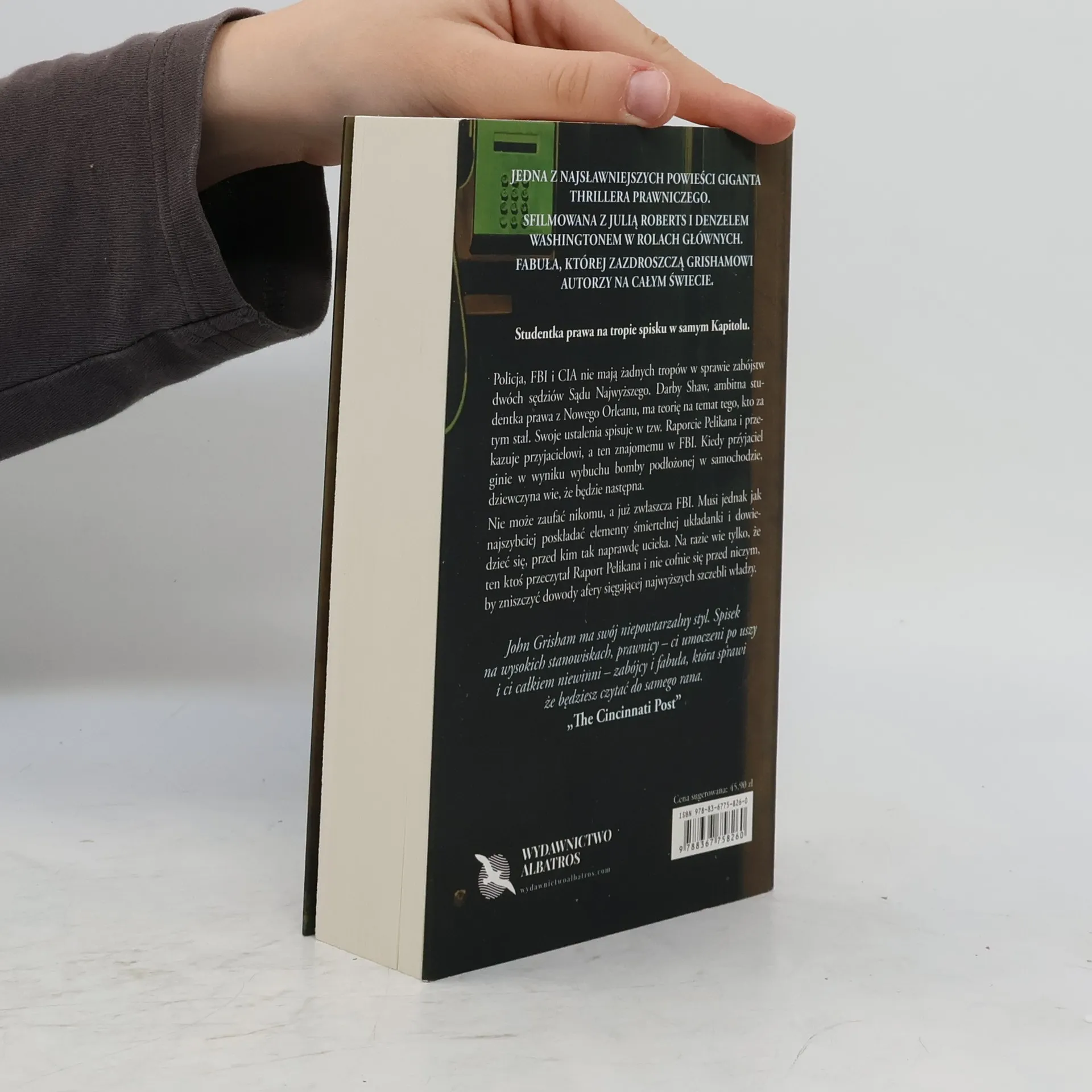 Jedna z najsławniejszych powieści giganta thrillera prawniczego – Johna Grishama. Sfilmowana z Julią Roberts i Denzelem Washingtonem w rolach głównych. Fabuła, której od lat zazdroszczą Grishamowi autorzy na całym świecie. Polityczne intrygi, walka o władzę i pytania o moralność w bezwzględnym świecie prawa i bezprawia. Studentka prawa na tropie spisku w samym Kapitolu. Zamordowano dwóch sędziów Sądu Najwyższego USA. FBI i CIA są bezradne. Darby Shaw, ambitna studentka prawa z Nowego Orleanu, ma teorię na temat tego, kto jest sprawcą. Swoje ustalenia spisuje w tzw. Raporcie Pelikana i przekazuje przyjacielowi, a ten znajomemu w FBI. Kiedy bomba podłożona w samochodzie zabija przyjaciela Darby, dziewczyna wie, że będzie następna. Nie może zaufać nikomu, a już zwłaszcza FBI. Musi jednak jak najszybciej poskładać elementy śmiertelnej układanki i dowiedzieć się, kto dokładnie chce ją zabić. Ten ktoś przeczytał Raport Pelikana i nie cofnie się przed niczym, by zniszczyć dowody niewyobrażalnej zbrodni. John Grisham ma swój niepowtarzalny styl. Spisek na wysokich stanowiskach, prawnicy – ci umoczeni po uszy, i ci całkiem niewinni – zabójcy i fabuła, która sprawi, że będziesz czytać do samego rana. „The Cincinnati Post” Grisham to mistrz budowania napięcia i prowadzenia akcji, ale w „Raporcie pelikana” przekroczył granice gatunku. To opowieść o sile ludzkiego ducha i nadziei, która potrafi pokonać nawet największe przeciwności. „The Guardian” „Raport pelikana” to powieść, która nie tylko dostarcza doskonałej rozrywki, ale także pokazuje, jak wiele zła może wyrządzić korporacja, kiedy działa bez kontroli. „Chicago Tribune”