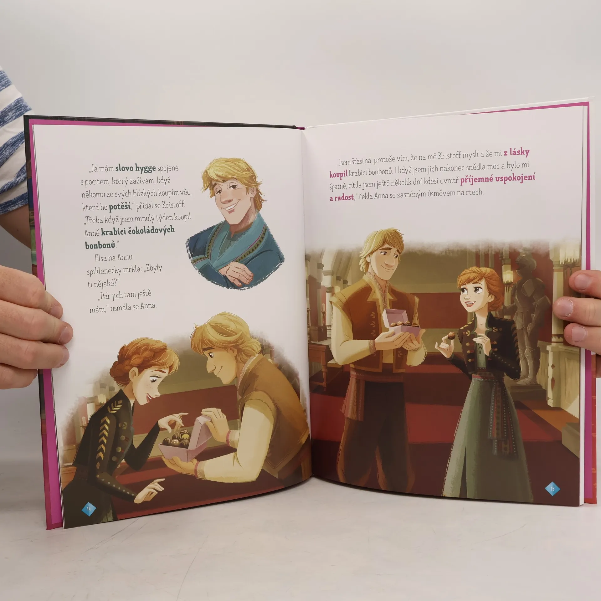 Olaf si v knihovně vypůjčil knihu s tajuplným názvem Hygge. Copak to znamená? Kamarádi to vědí, je to pohoda a pocit štěstí. Jeden po druhém pak ostatním sdělují, kdy takovou radost zažívají. Ve druhé části pak na vás čeká šest milých příběhů, které si kamarádi vypravují večer u krbu. Většina z nich je o tajuplných a bájných stvořeních, které najdete jen v Ledovém království!