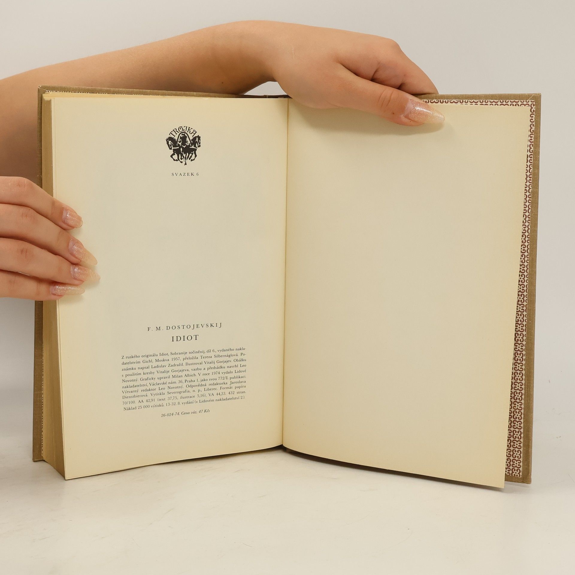 Proslulý psychologický román, v němž Dostojevský zobrazuje ideál dokonalého a krásného člověka. Hlavní hrdina kníže Myškin okouzluje svou nevinností a vyrovnaností prostředí ruských měšťáků a kupců, lidi mravně a citově narušené, nedokáže však v nich vzkřísit člověka a hyne spolu s nimi. Autor ukazuje hrdinu jako typ, který by mohl obrodit svět, přičemž čtenář poznává, že hrdina svou filosofií pokory a všelásky přivádí do neštěstí i ty, které miluje, a nakonec sám sebe. 26-024-74