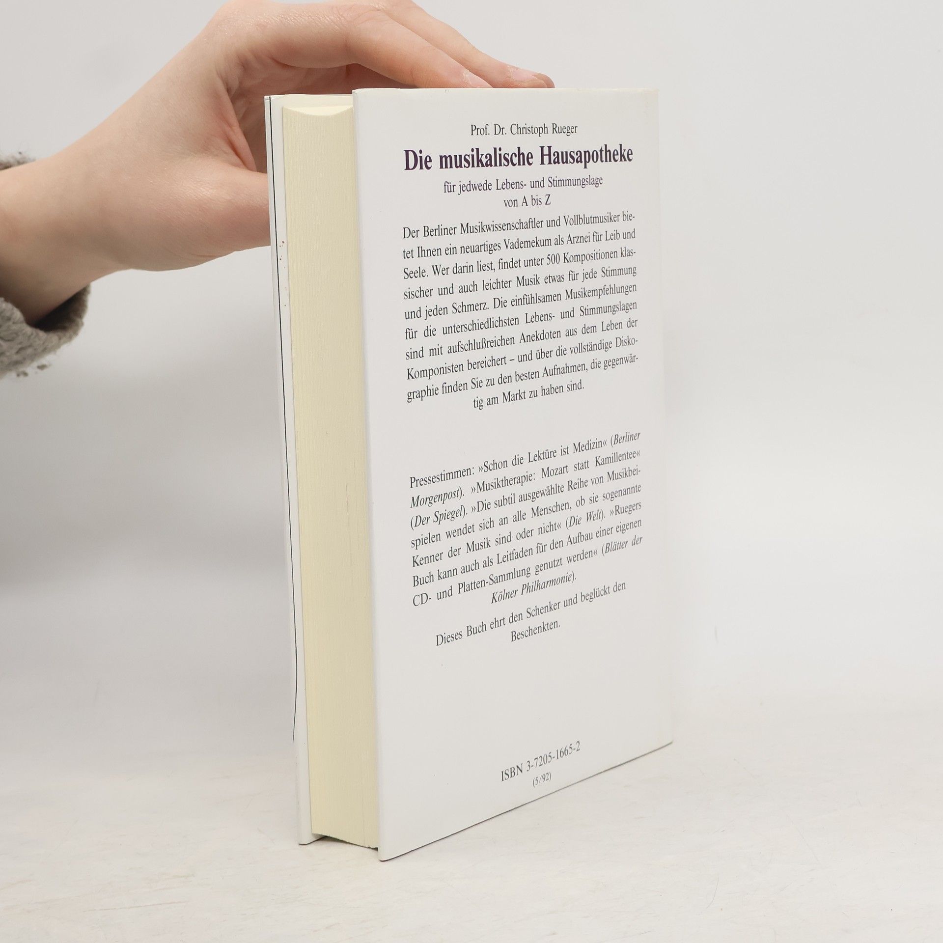 Musik ist ein Heilmittel: Sie löst Aggressionen, stärkt das Gemüt, lindert Schmerzen und verbreitet Heiterkeit. Sie gibt Kraft für Leib und Seele, ist hilfreich, wohltuend und freudespendend für alle Menschen, die Musik lieben - ob Klassik oder Moderne, Konzert, Oper oder Musical. Die richtige Musik im richtigen Augenblick wirkt oft wahre Wunder.Prof. Dr. Christoph Rueger stellt in seiner Musikalischen Hausapotheke rund 500 Musikstücke einfühlsam vor, bereichert durch kleine aufschlußreiche Anekdoten aus dem Leben der Komponisten und ergänzt mit einer aktuellen Diskographie.Ein "klingendes" Buch für alle Stimmungs- und Lebenslagen: Abschied und Einsamkeit, Heiterkeit und Hoffnung, Sehnsucht und Liebe, Entspannung und Enttäuschung, Krankheit und Melancholie...