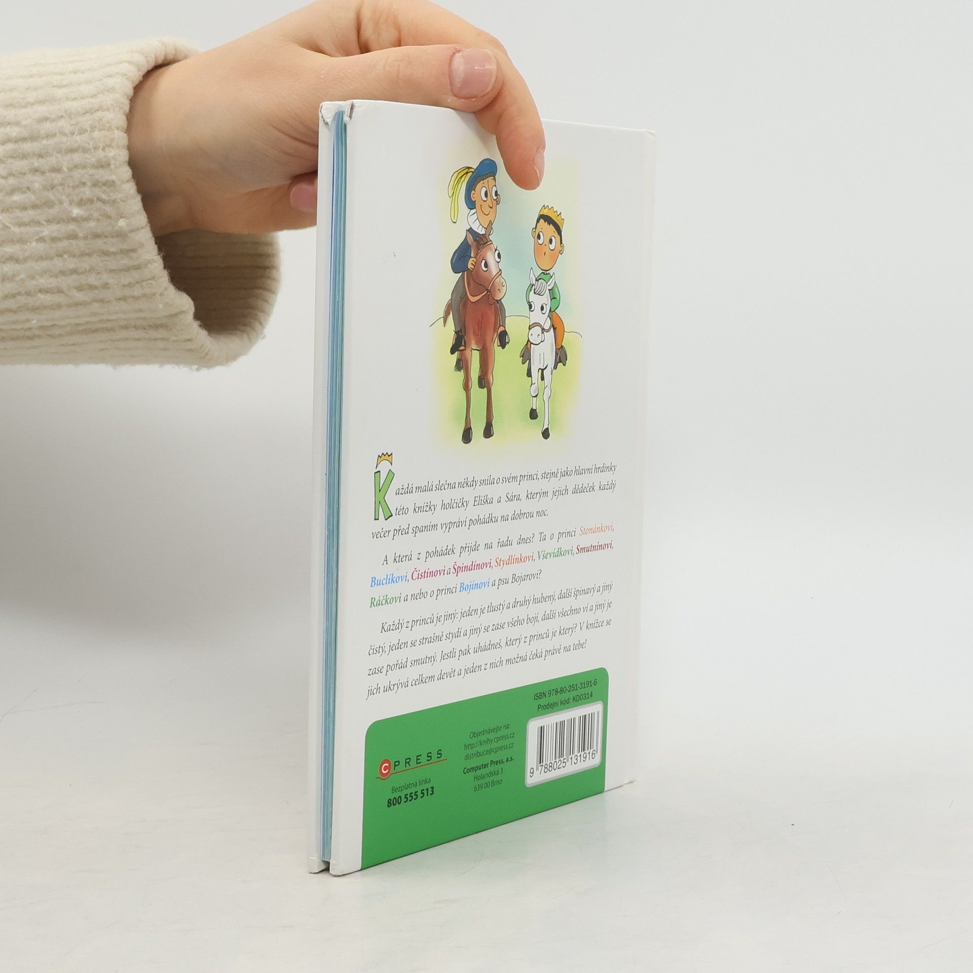 Každá malá slečna někdy snila o svém princi, stejně jako hlavní hrdinky této knížky holčičky Eliška a Sára, kterým jejich dědeček každý večer před spaním vypráví pohádku na dobrou noc. A která z pohádek přijde na řadu dnes? Ta o princi Stonánkovi, Bu clí ko vi, Čistínovi a Špindínovi, Stydlínkovi, Vševídkovi, Smutnínovi, Ráčkovi a nebo o princi Bojínovi a psu Bojarovi? Každý z princů je jiný: jeden je tlustý a druhý hubený, další špinavý a jiný čistý, jeden se strašně stydí a jiný se zase všeho bojí, další všechno ví a jiný je zase pořád smutný. Jestli pak uhádneš, který z princů je který? V knížce se jich ukrývá celkem devět a jeden z nich možná čeká právě na tebe!