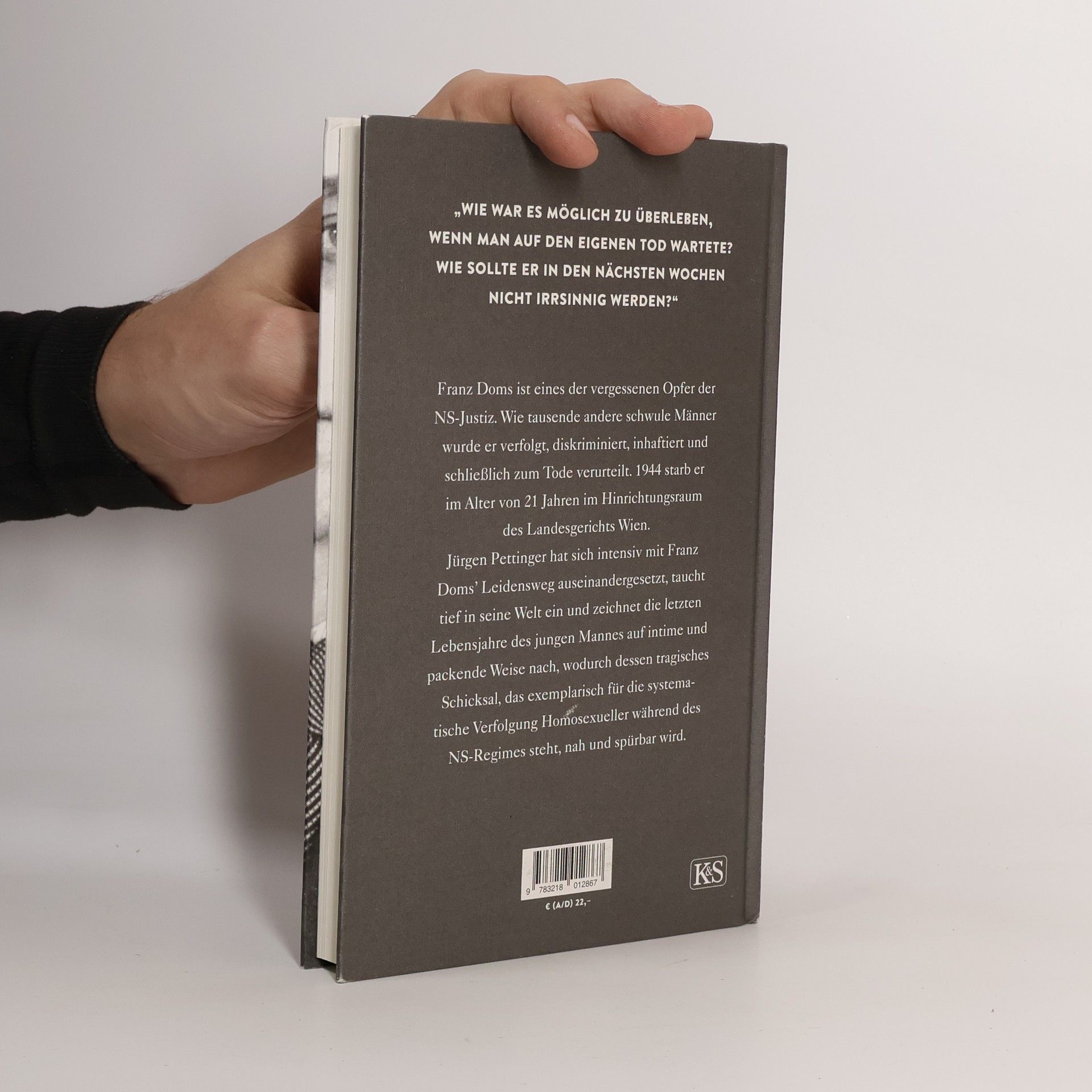 Franz Doms ist eines der vergessenen Opfer der NS-Justiz. Wie tausende andere schwule Männer wurde er verfolgt, diskriminiert, inhaftiert und schließlich zum Tode verurteilt. 1944 starb er im Alter von 21 Jahren im Hinrichtungsraum des Landesgerichts Wien. Bis zu seinem Tod blieb er loyal und denunzierte nie andere, um sich selbst zu retten. Jürgen Pettinger hat sich intensiv mit Franz Doms Leidensweg auseinandergesetzt, erzählt bildhaft, was über sein Leben bekannt ist, zitiert aus überlieferten Ermittlungs- und Gerichtsakten und bildet Dialoge anhand von Gesprächsprotokollen nach. Doch Pettingers Zugang ist mehr als eine bloße Rekonstruktion der Fakten. Er taucht tief in die Welt Franz Doms’ ein und zeichnet dessen letzte Lebensjahre auf intime und packende Weise nach, wodurch sein tragisches Schicksal, das exemplarisch für die systematische Verfolgung Homosexueller während des NS-Regimes steht, nah und spürbar wird. „Er ist ein völlig haltloser, seinen widernatürlichen Trieben gegenüber machtloser Verbrecher, bei dem von Freiheitsstrafen kein erzieherischer oder abschreckender Erfolg mehr zu erwarten ist.” Anklageschrift gegen Franz Doms