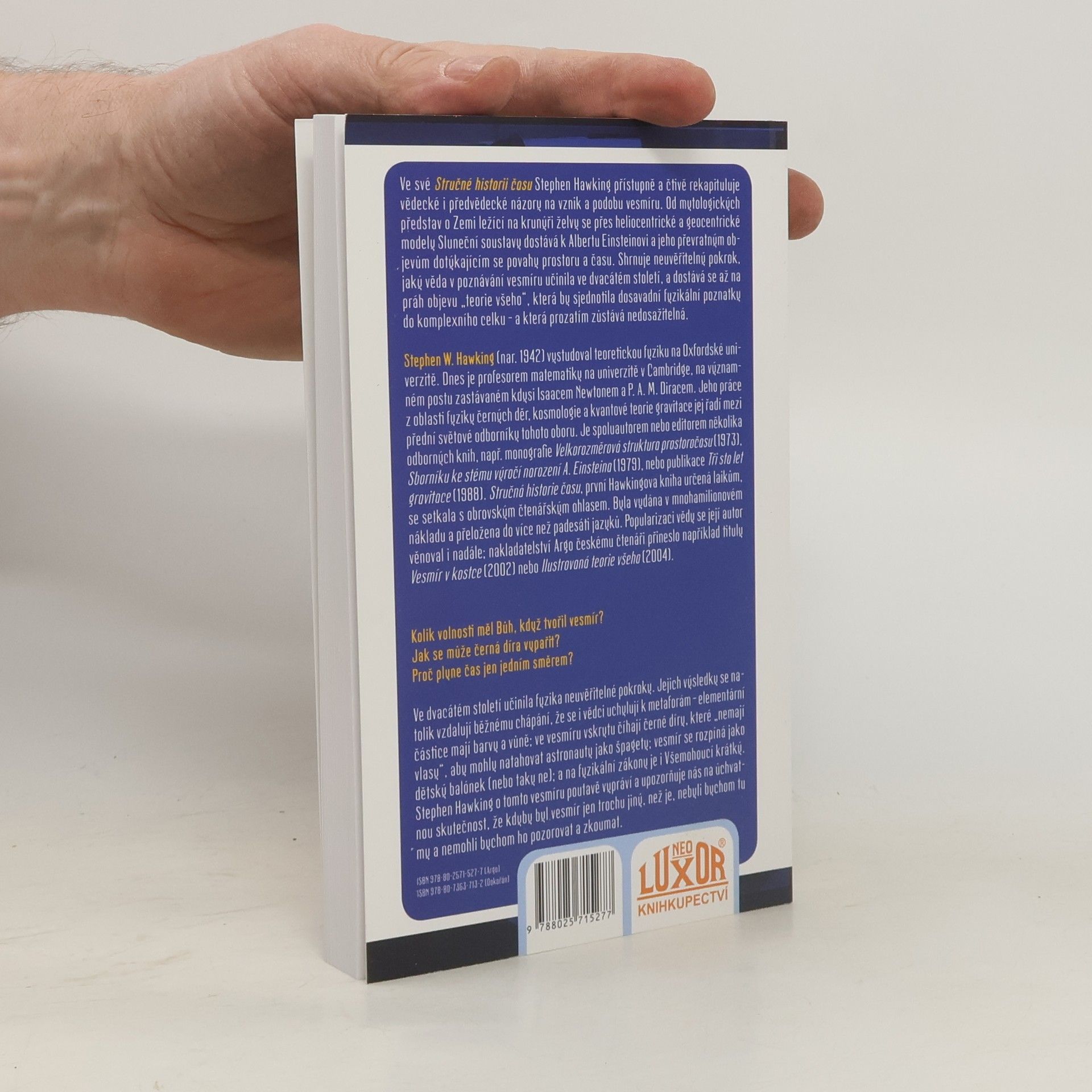 Jaká je povaha prostoru a času? Kde se vzal vesmír a kam směřuje? Mohl se na jeho vzniku podílet Bůh? Dá se cestovat časem? Co se stane astronautovi v černé díře? Na takové otázky se pokouší co nejsrozumitelněji odpovědět britský matematik a teoretický fyzik Stephen Hawking. Od tohoto autora již česky vyšly knihy: Vesmír v kostce, Ilustrovaná teorie všeho, Stručná historie času v obrazech, Stručnější historie času.