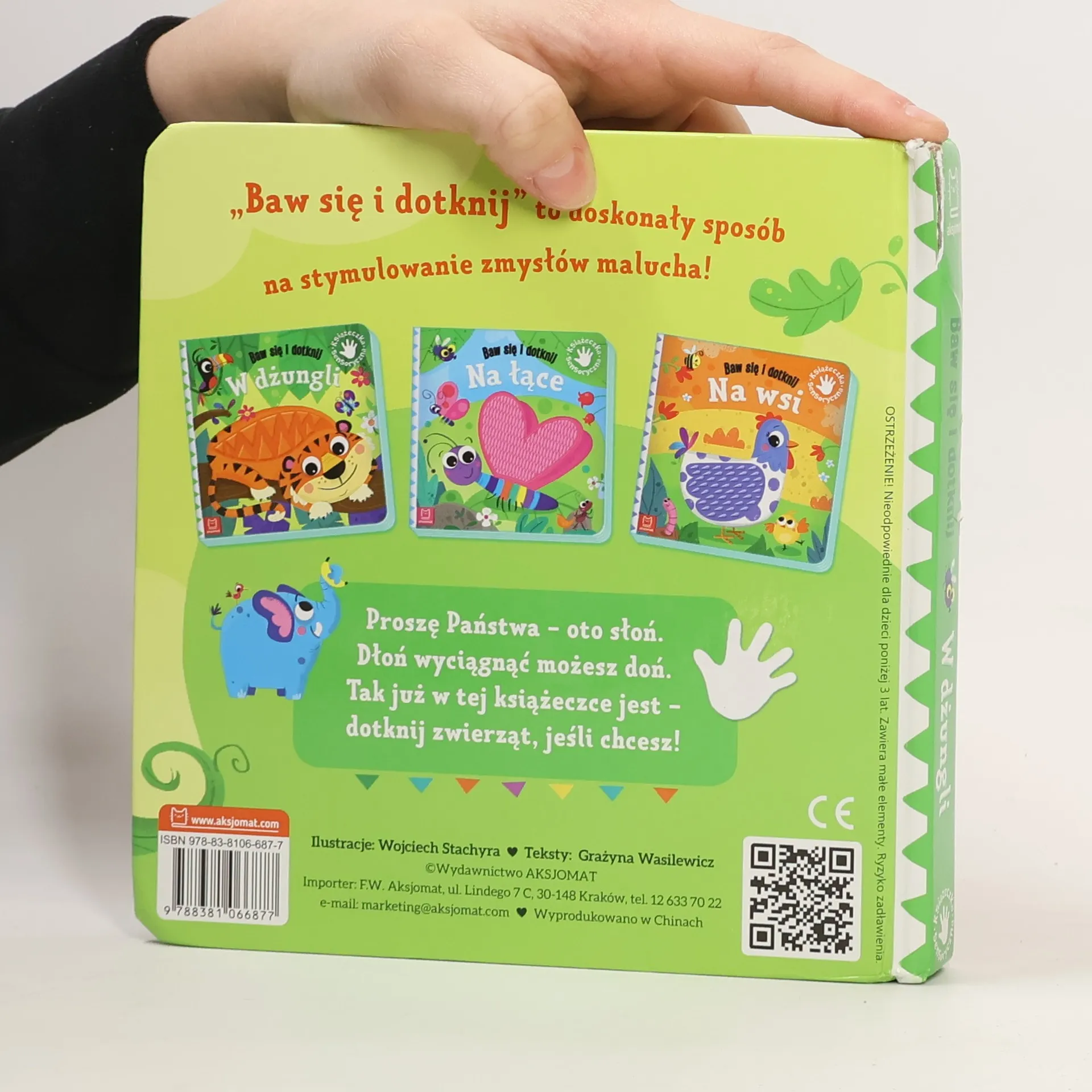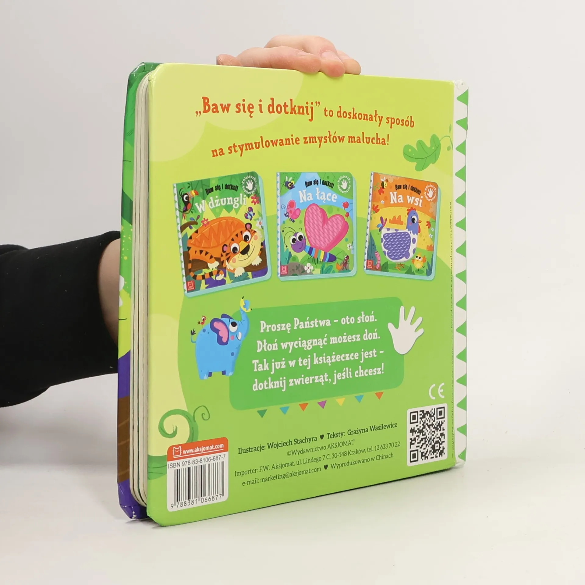 Proszę Państwa oto słoń. Dłoń wyciągnąć możesz doń. Tak już w tej książeczce jest dotknij zwierząt, jeśli chcesz! Książeczka Baw się i dotknij: - doskonała zabawa z dzieckiem, - sposób na stymulowanie zmysłów malucha, - do czytania, oglądania i dotykania.