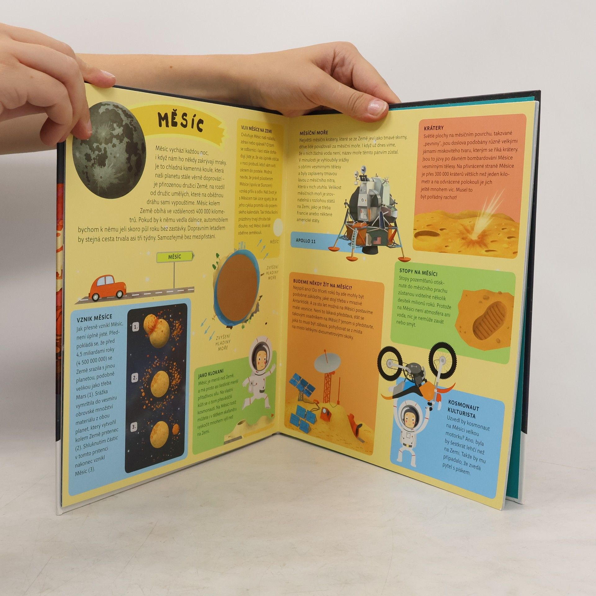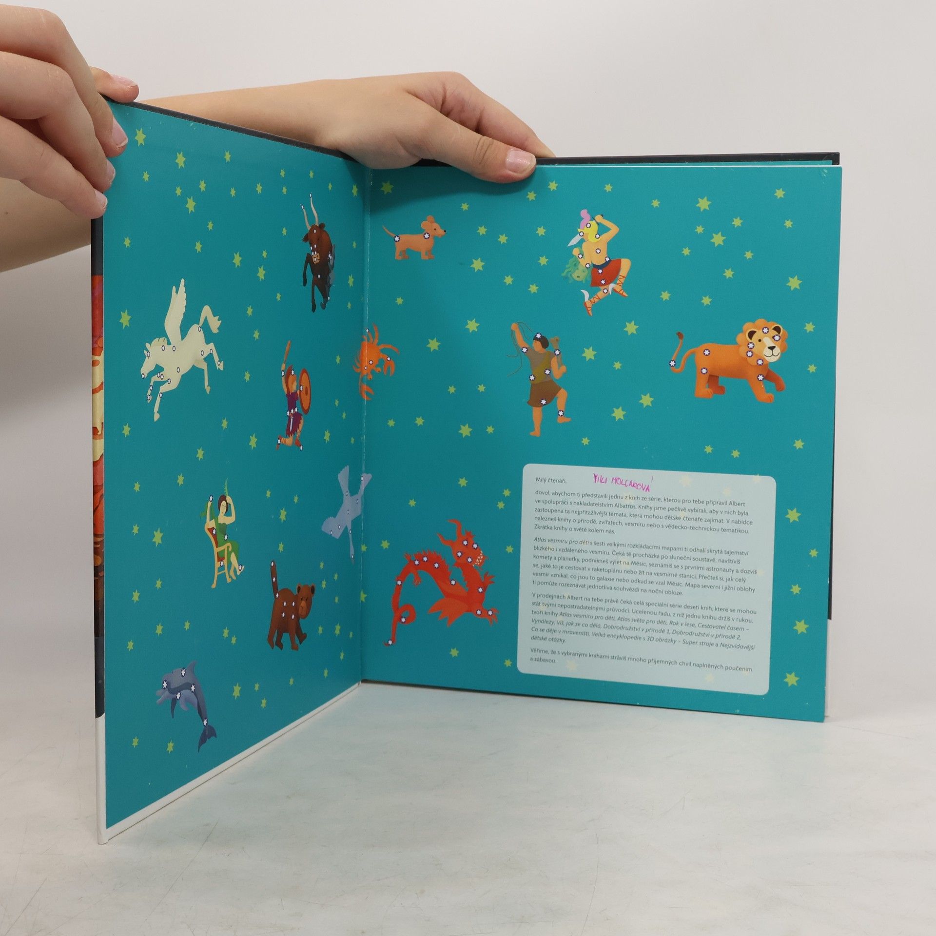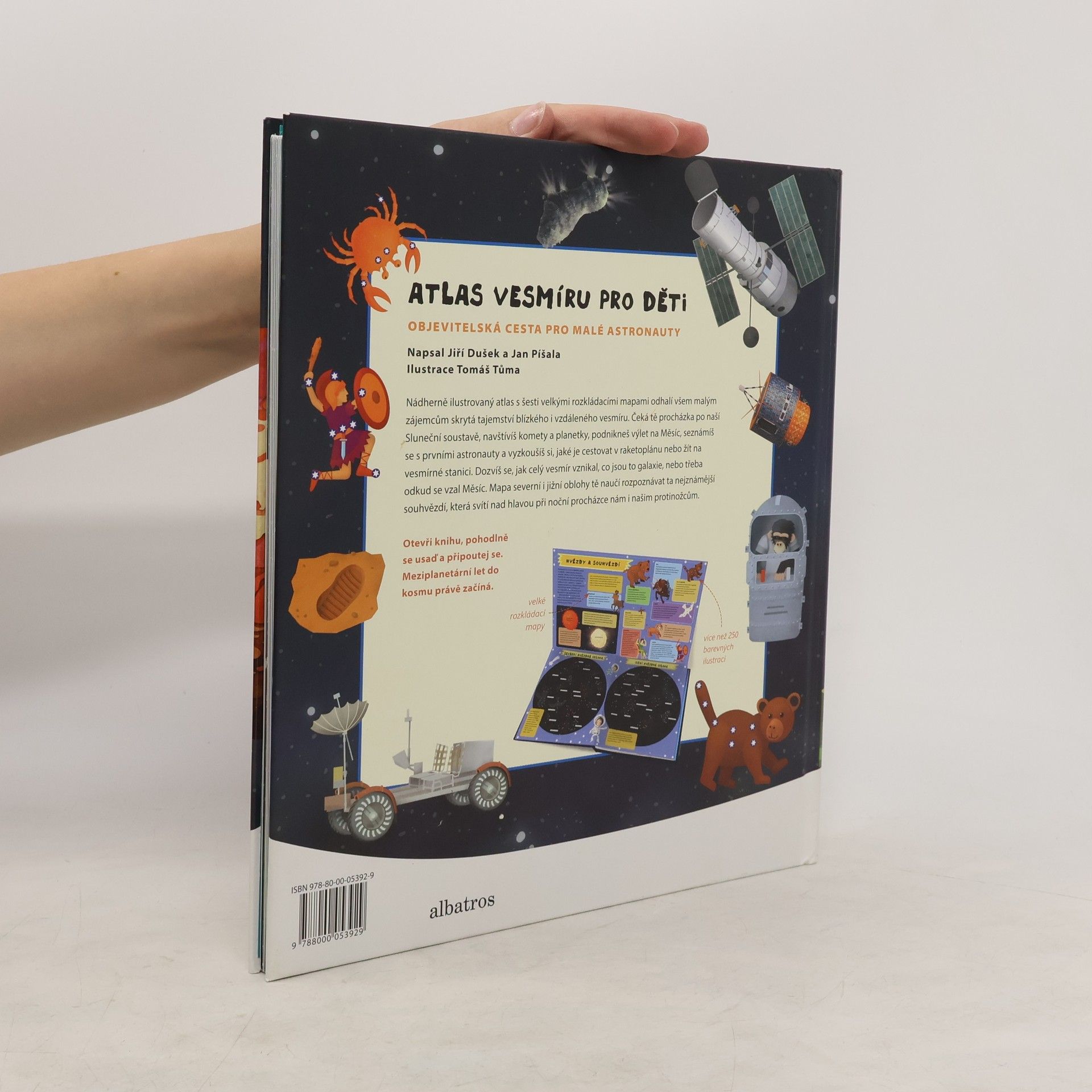 Nádherně ilustrovaný atlas s šesti velkými rozkládacími mapami odhalí všem malým zájemcům skrytá tajemství blízkého i vzdáleného vesmíru. Čeká tě procházka po naší Sluneční soustavě, navštívíš komety a planetky, podnikneš výlet na Měsíc, seznámíš se s prvními astronauty a vyzkoušíš si, jaké je cestovat v raketoplánu nebo žít na vesmírné stanici. Mapa severní i jižní oblohy tě naučí rozpoznávat ta nejznámější souhvězdí.