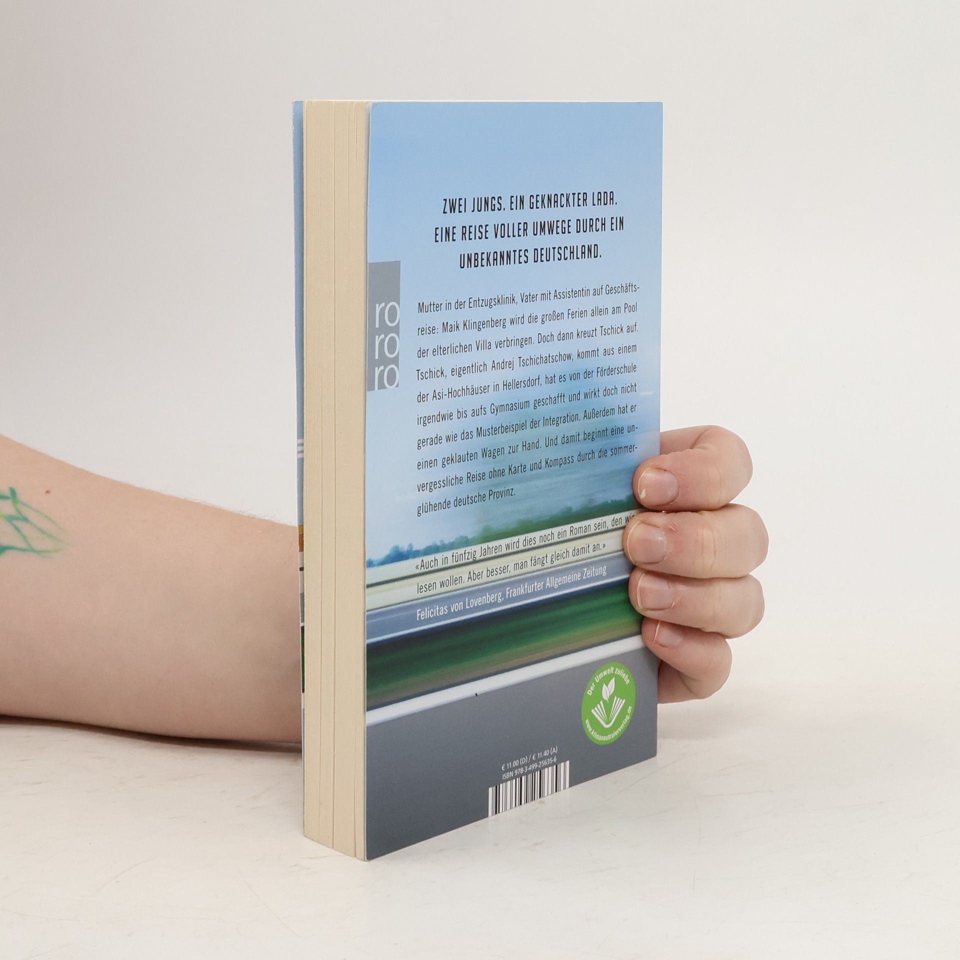 «Ein klappriges Auto kam die Straße runtergefahren. Es fuhr langsam auf unser Haus zu und bog in die Garagenauffahrt ein. Eine Minute stand der hellblaue Lada Niva mit laufendem Motor vor unserer Garage, dann wurde der Motor abgestellt. Die Fahrertür ging auf, Tschick stieg aus. Er legte beide Ellenbogen aufs Autodach und sah zu, wie ich den Rasen sprengte. ‹Ah›, sagte er, und dann sagte er lange nichts mehr. ‹Macht das Spaß?›» Mutter in der Entzugsklinik, Vater mit Assistentin auf Geschäftsreise: Maik Klingenberg wird die großen Ferien allein am Pool der elterlichen Villa verbringen. Doch dann kreuzt Tschick auf. Tschick, eigentlich Andrej Tschichatschow, kommt aus einem der Asi-Hochhäuser in Hellersdorf, hat es von der Förderschule irgendwie bis aufs Gymnasium geschafft und wirkt doch nicht gerade wie das Musterbeispiel der Integration. Außerdem hat er einen geklauten Wagen zur Hand. Und damit beginnt eine Reise ohne Karte und Kompass durch die sommerglühende deutsche Provinz, unvergesslich wie die Flussfahrt von Tom Sawyer und Huck Finn.