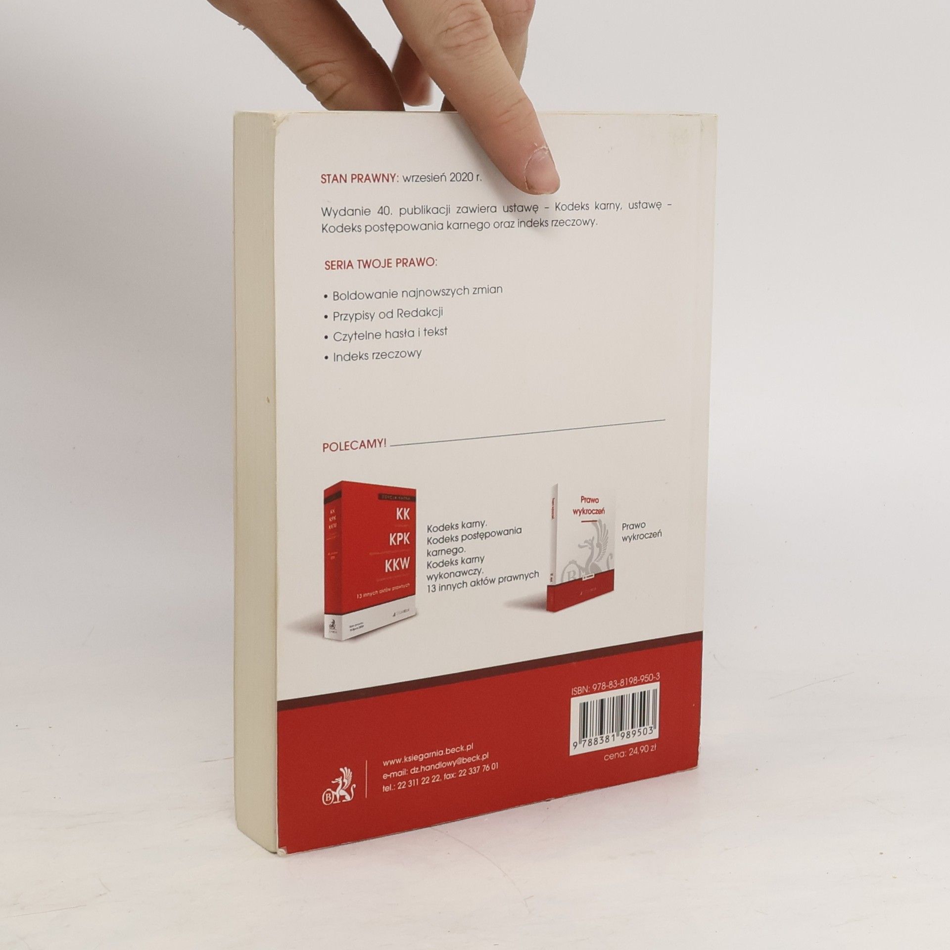 Opis książki Pliki do pobrania Stan prawny: 1 września 2020 r. Publikacja obejmuje zmiany wchodzące w życie: Kodeks karny Nowy tekst jednolity (Dz.U. z 2020 r. poz. 1444). Kodeks postępowania karnego 12.3.2020 r. - Wyrok Trybunału Konstytucyjnego z 04.03.2020 r. sygnatura: P 22/19 (Dz.U. z 2020 r. poz. 413), 31.3.2020 r. - Ustawa z 31.03.2020 r. o zmianie ustawy o szczególnych rozwiązaniach związanych z zapobieganiem, przeciwdziałaniem i zwalczaniem COVID-19, innych chorób zakaźnych oraz wywołanych nimi sytuacji kryzysowych oraz niektórych innych ustaw (Dz.U. z 2020 r. poz. 568), 24.6.2020 r. - Ustawa z 19.06.2020 r. o dopłatach do oprocentowania kredytów bankowych udzielanych przedsiębiorcom dotkniętym skutkami COVID-19 oraz o uproszczonym postępowaniu o zatwierdzenie układu w związku z wystąpieniem COVID-19 (Dz.U. z 2020 r. poz. 1086), 26.8.2020 r. - Wyrok Trybunału Konstytucyjnego z 19.08.2020 r. sygnatura: K 46/15 (Dz.U. z 2020 r. poz. 1458).