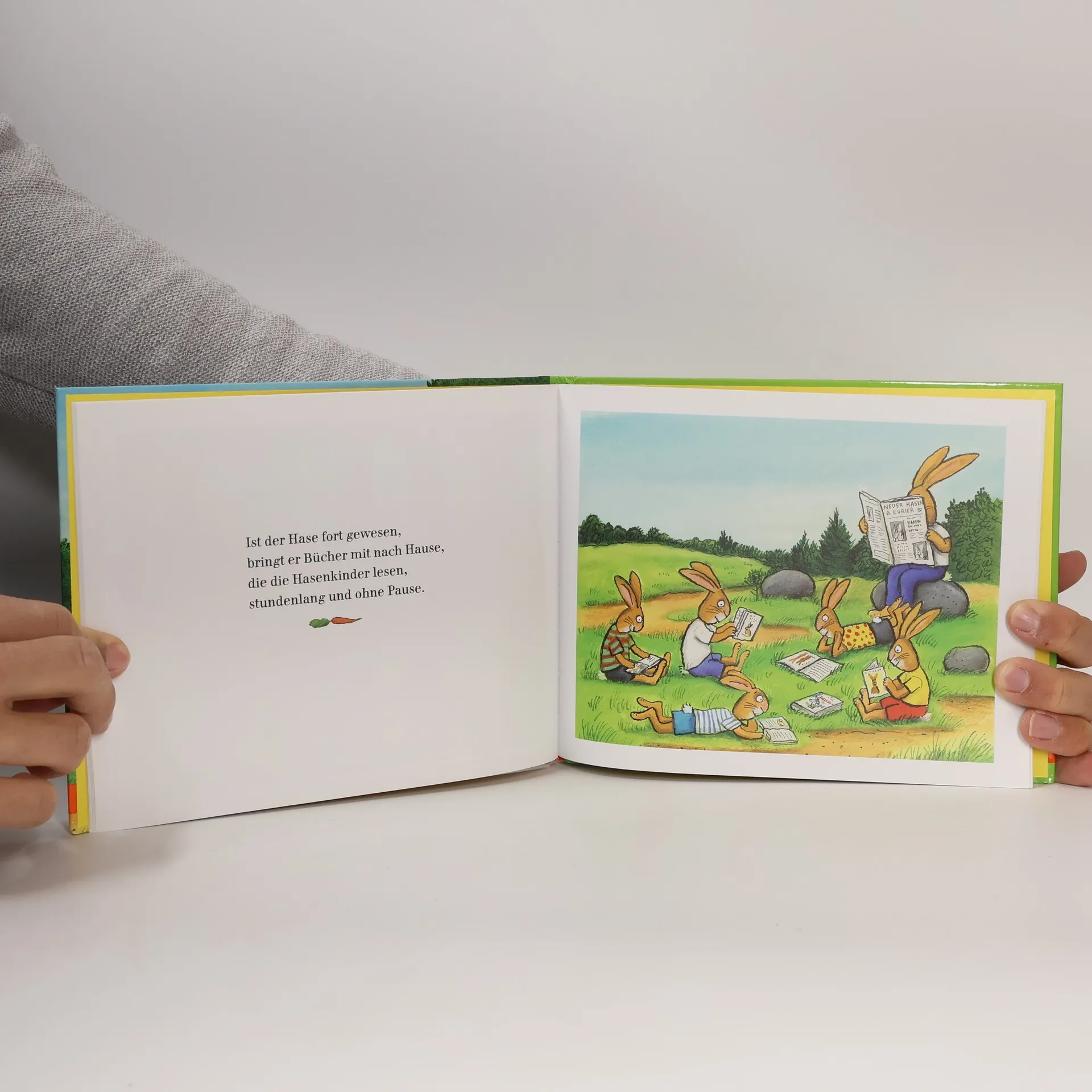 Diese Hasen sind beneidenswert: Mit spielerischer Leichtigkeit bringt Axel Scheffler die von Frantz Wittkamp ersonnenen Hasenweisheiten auf den Punkt. Ob Hasen Purzelbäume schlagen, in der Sonne ihr Fell trocknen oder singen wie die Raben – immer sind sie frohgemut und äußerst gut gelaunt. Ein Bilderbuch vom Illustrator des Grüffelo - nicht nur für Ostern.
