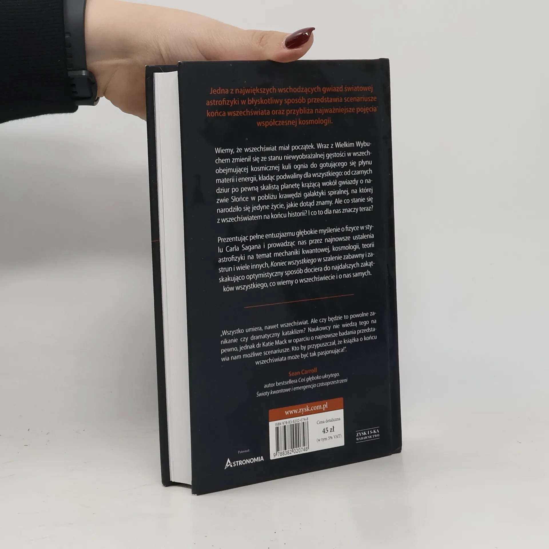 Jedna z największych wschodzących gwiazd w światowej astrofizyce w przystępny i błyskotliwy sposób przedstawia pięć sposobów, w jaki Wszechświat może się zakończyć, oraz w trakcie fascynującego opisu każdego z tych scenariuszy omawia najważniejsze pojęcia w kosmologii. Wiemy, że Wszechświat miał początek. Wraz z Wielkim Wybuchem zmienił się ze stanu niewyobrażalnej gęstości w wszechobejmującej kosmicznej kuli ognia do gotującego się płynu materii i energii, kładąc podwaliny dla wszystkiego, od czarnych dziur po pewną skalistą planetę krążącą wokół gwiazdy w pobliżu krawędzi galaktyki spiralnej, na której narodziło się jedyne życie, jakie dotąd znamy. Ale co stanie się z Wszechświatem na końcu historii? I co to dla nas znaczy teraz? Prowadząc nas przez najnowsze ustalenia astrofizyki i główne koncepcje w mechanice kwantowej, kosmologii, teorii strun i wiele innych, Koniec wszystkiego w szalenie zabawny i zaskakująco optymistyczny sposób dociera do najdalszych zakątków wszystkiego, co wiemy o kosmosie. „Niezwykła książka, niebywale poszerzająca umysł. Katie Mack przypomina o naszym miejscu w nieogarnionym kosmosie”. James Gleick, trzykrotny zdobywca Nagrody Pulitzera „Ekscytująca wycieczka po potencjalnych scenariuszach kosmicznej zagłady... Zaraźliwy entuzjazm dr Mack do przekazywania w przystępny sposób trudnych zagadnień kosmologii czyni tę książkę absolutnie wyjątkową”. „Wall Street Journal”