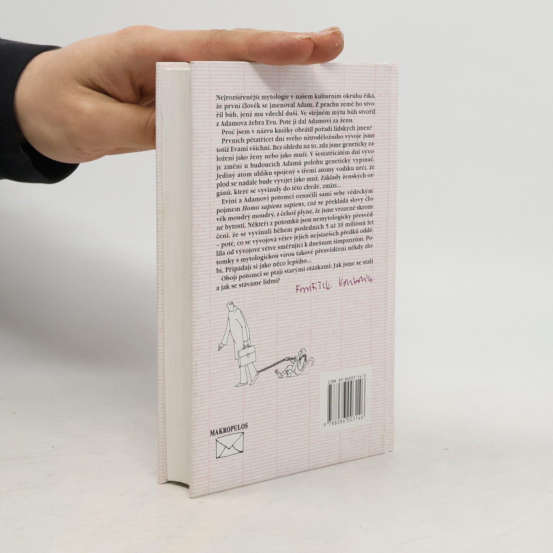 Z úvodu: Nejrozšířenější mytologie v našem kulturním okruhu říká, že první člověk se jmenoval Adam. Z prachu země ho stvořil bůh, jenž mu vdechl duši. Ve stejném mýtu bůh stvořil z Adamova žebra Evu. Poté ji dal Adamovi za ženu. Proč jsem v názvu knížky obrátil pořadí lidských jmen? Prvních pětatřicet dní svého nitroděložního vývoje jsme totiž Evami všichni. Bez ohledu na to, zda jsme geneticky založeni jako ženy nebo jako muži. V šestatřicátém dni vývoje změní u budoucích Adamů polohu genetický vypínač. Jediný atom uhlíku spojený s třemi atomy vodíku určí, že plod se nadále bude vyvíjet jako muž. Základy ženských orgánů, které se vyvinuly do této chvíle, zmizí... Evini a Adamovi potomci označili sami sebe vědeckým pojmem Homo sapiens sapiens, což se překládá slovy člověk moudrý moudrý, z čehož plyne, že jsme vrozeně skromné bytosti. Někteří z potomků jsou nemytologicky přesvědčení, že se vyvinuli během posledních 5 až 10 miliónů let - poté, co se vývojová větev jejich nejstarších předků oddělila od vývojové větve směřující k dnešním šimpanzům. Potomky s mytologickou vírou takové přesvědčení někdy zlobí. Připadají si jako něco lepšího... Obojí potomci se ptají starými otázkami: Jak jsme se stali a jak se stáváme lidmi? autor