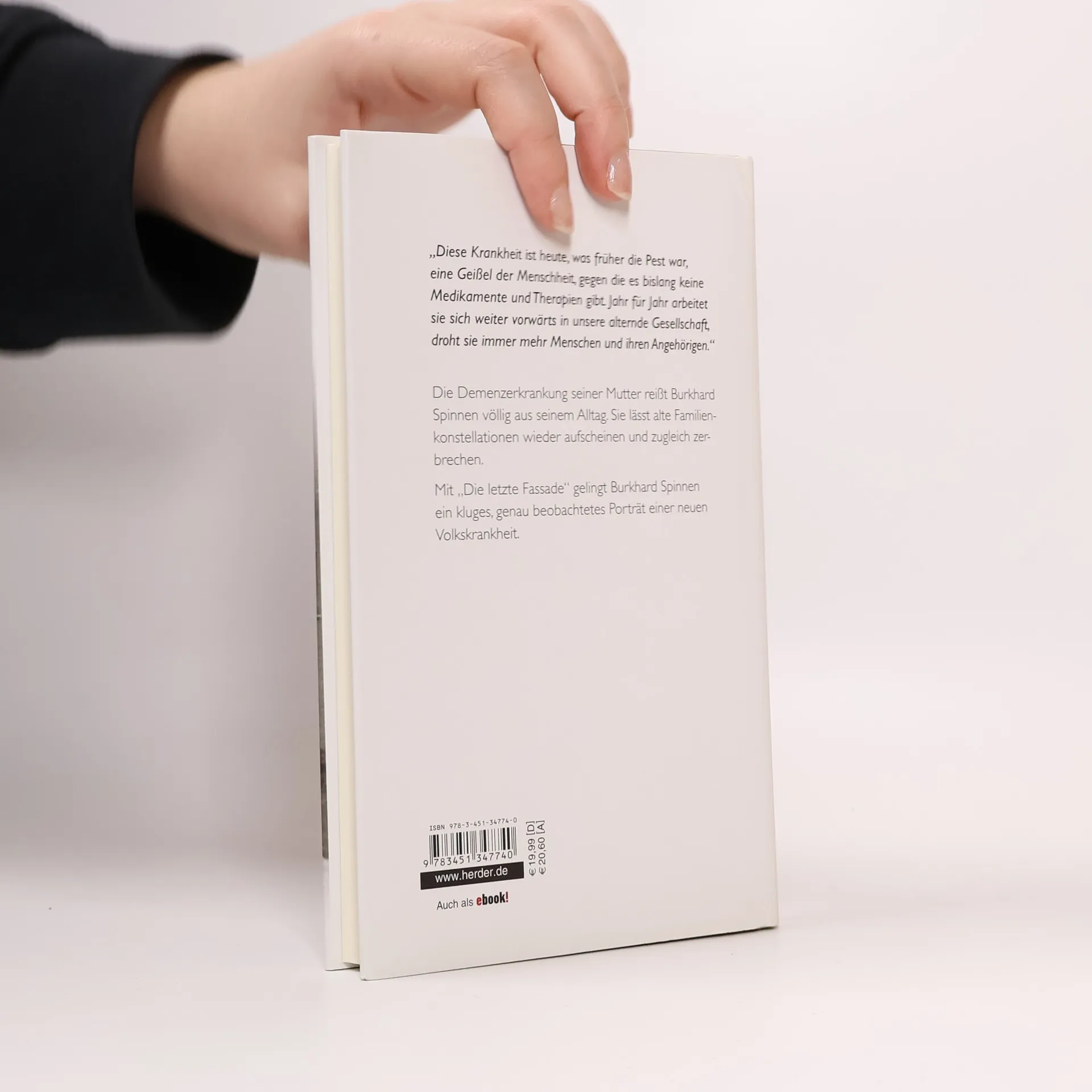 Lange Zeit hat er es nicht bemerkt. Das langsame Versinken seiner Mutter in die Demenz stellt Burkhard Spinnen vor eine Aufgabe, die ihn stets aufs Neue überfordert und sein Leben völlig durcheinander bringt. Unvermittelt verkehren sich alle Verhältnisse, die Mutter-Sohn-Beziehung erfährt eine radikale Veränderung. Dazu belastet die dauernde Konfrontation mit der Krankheit der Mutter den eigenen Lebensentwurf. "Die letzte Fassade" ist ein ehrliches, ein bewegendes und glänzend geschriebenes Buch über die neue Volkskrankheit Demenz.