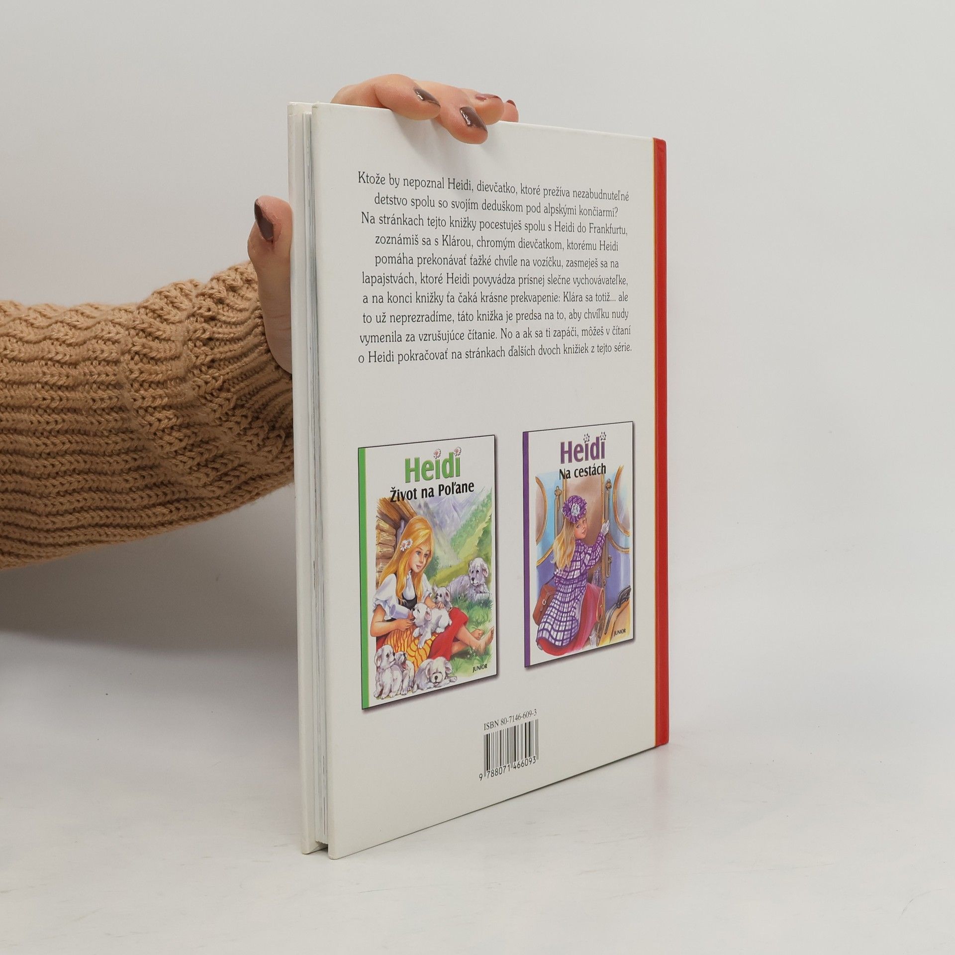 Ktože by nepoznal Heidi, dievčatko, ktoré prežíva nezabudnuteľné detstvo spolu so svojím deduškom pod alpskými končiarmi?Na stránkach tejto knižky pocestuješ spolu s Heidi do Frakfurtu, zoznámiš sa s Klárou, chromým dievčatkom, ktorému Heidi pomáha prekonávať ťažké chvíle na vozíčku, zasmeješ sa na lapajstvách, ktoré Heidi povyvádza prísnej slečne vychovávateľke, a na konci knižky ťa čaká krásne Klára sa totiž... ale to už neprezradíme, táto knižka je predsa na to, aby chvíľku nudy vymenila za vzrušujúce čítanie. A ak sa ti zapáči, môžeš v čítaní pokračovať na stránkach ďalších dvoch knižiek z tejto série.