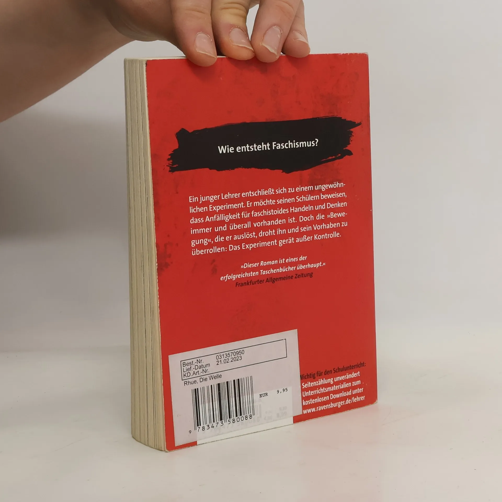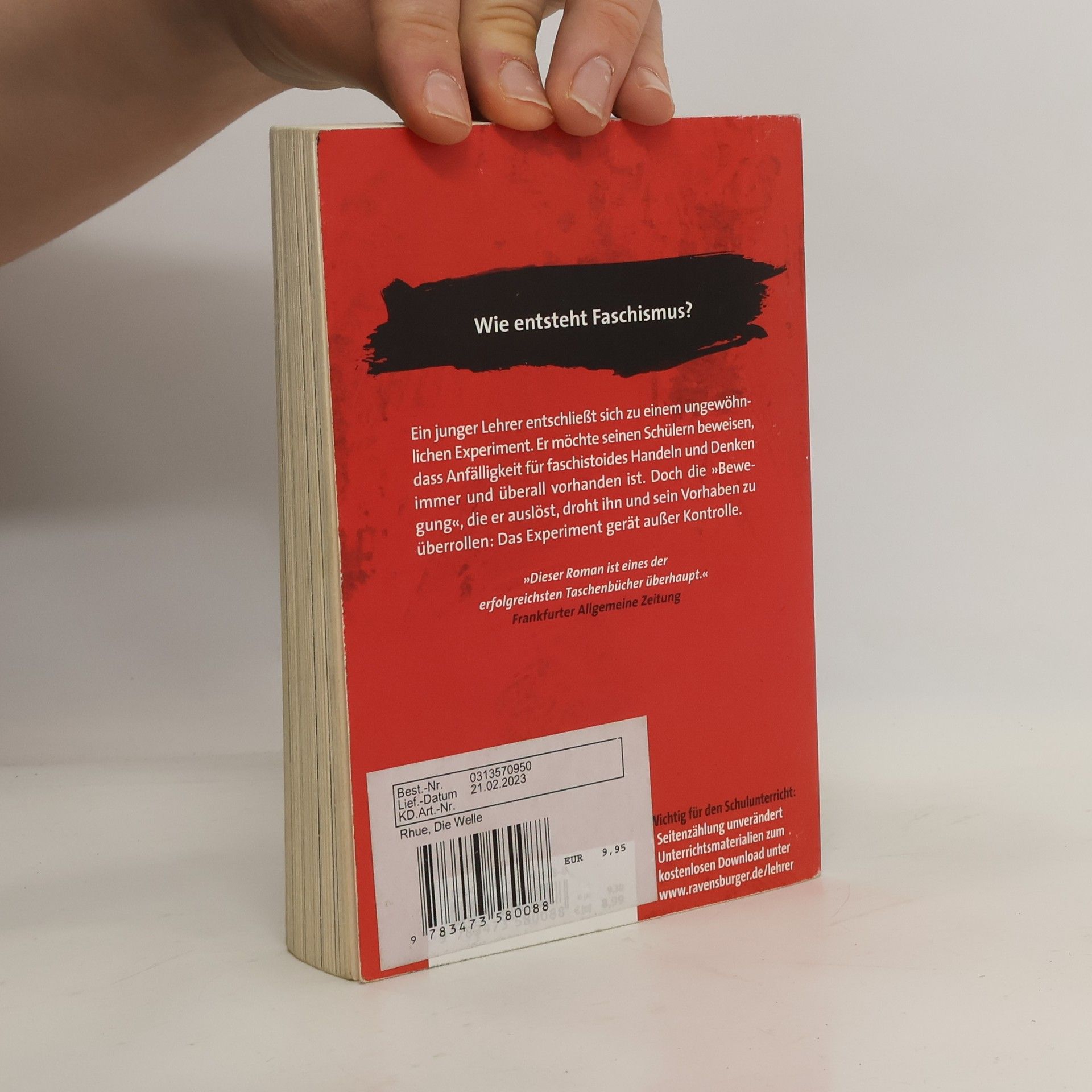 Der Jugendbuchbestseller zum Thema Rechtsextremismus, Faschismus und Nationalsozialismus Wie entsteht Faschismus? Als es im Geschichtsunterricht um Nationalsozialismus und Rechtsextremismus geht, beschließt ein junger Lehrer, ein ungewöhnliches Experiment durchzuführen. Er möchte seinen Schülern beweisen, dass Anfälligkeit für faschistoides Handeln und Denken nicht etwas ist, das nur andere Menschen betrifft – Faschismus ist hier mitten unter uns und in jedem von uns. Doch die „Bewegung“, die er auslöst, droht ihn und sein Vorhaben zu überrollen: Das Experiment gerät außer Kontrolle. Wichtig für den Schulunterricht: Seitenzählung unverändert! Morton Rhues Klassiker DIE WELLE beschreibt eindringlich und gegenwartsbezogen wie leicht Menschen verführt, manipuliert und instrumentalisieren werden können. Der Roman basiert auf wahren Begebenheiten an einer Highschool im kalifornischen Palo Alto. Zu diesem Buch gibt es „Materialien zur Unterrichtspraxis“ der Ravensburger Verlag GmbH.
