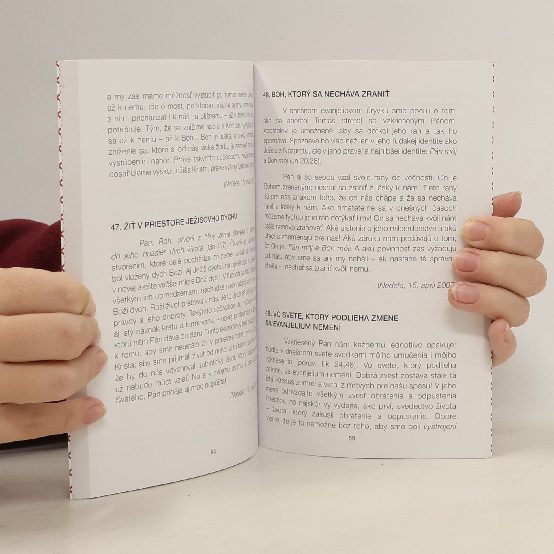 Pretože miloval svojich, čo boli na svete, miloval ich do krajnosti (Jn 13,1). Boh miluje svoje stvorenie, miluje človeka. Miluje ho i v jeho páde a neponecháva ho na seba samého. On miluje až do krajnosti. Namáha sa so svojou láskou až do samého konca tým, že zostupuje dolu zo svojej božskej slávy. Skladá zo seba šat svojej božskej slávy a oblieka si šat otroka. Schádza až do tej najspodnejšej hlbiny nášho pádu. Tam si pred nás kľaká a preukazuje nám službu otroka; umýva naše zašpinené nohy, aby sme my mohli byť prijatí k prestretému stolu Boha a stali sa hodnými zaujať miesto za jeho stolom - niečo, čo by sme sami nikdy nedokázali ani nesmeli urobiť. (Benedikt XVI.) Vstal som z mŕtvych a odteraz som už stále s tebou, hovorí Zmŕtvychvstalý každému jednému z nás. Moja ruka ťa podopiera. KdekolVek by ti hrozilo, že padneš, padneš do mojich rúk. Ja stojím dokonca aj pri bráne smrti. Tam, kde ťa nik nemôže sprevádzať a kde si nemôžeš nič zobrať so sebou, tam ťa očakávam ja a mením pre teba tmy na svetlo. (Benedikt XVI.)