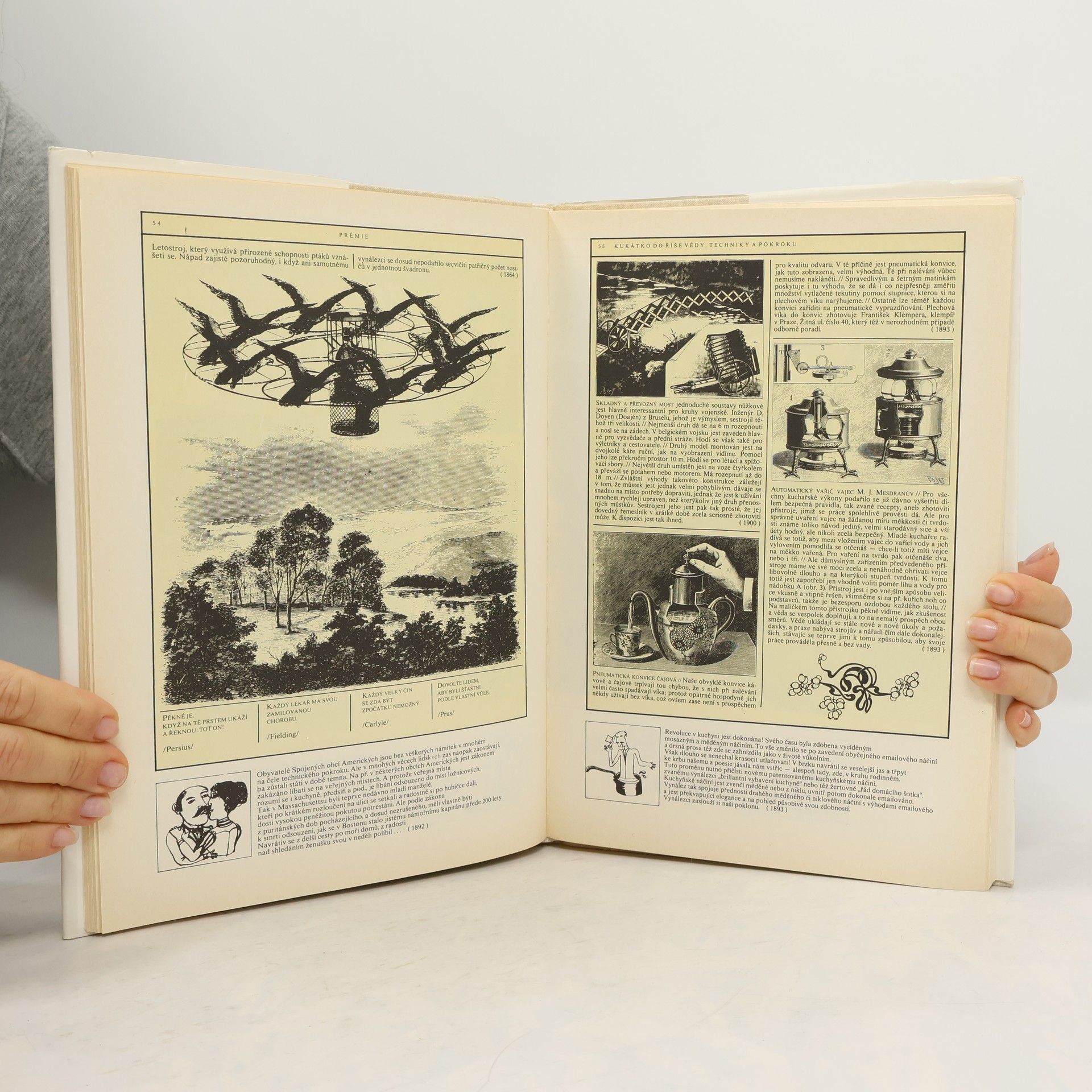 Kukátko do říše vědy, techniky a pokroku. Členská knižnice nakl. Svoboda. Zábavná členska prémie.Z časopisů, vycházejících v 2. polovině 19. století a před první světovou válkou, vybrali autoři různé inzeráty a informace o kuriiózních vynálezech s originálními obrázky. Kromě důmyslných zařízení k usnadnění práce iběžnéhoživota, zdravotnických přístrojů, nových dopravních prostředků apod. upozorňují i na objevy, které přispěly ke skutečnému pokroku.