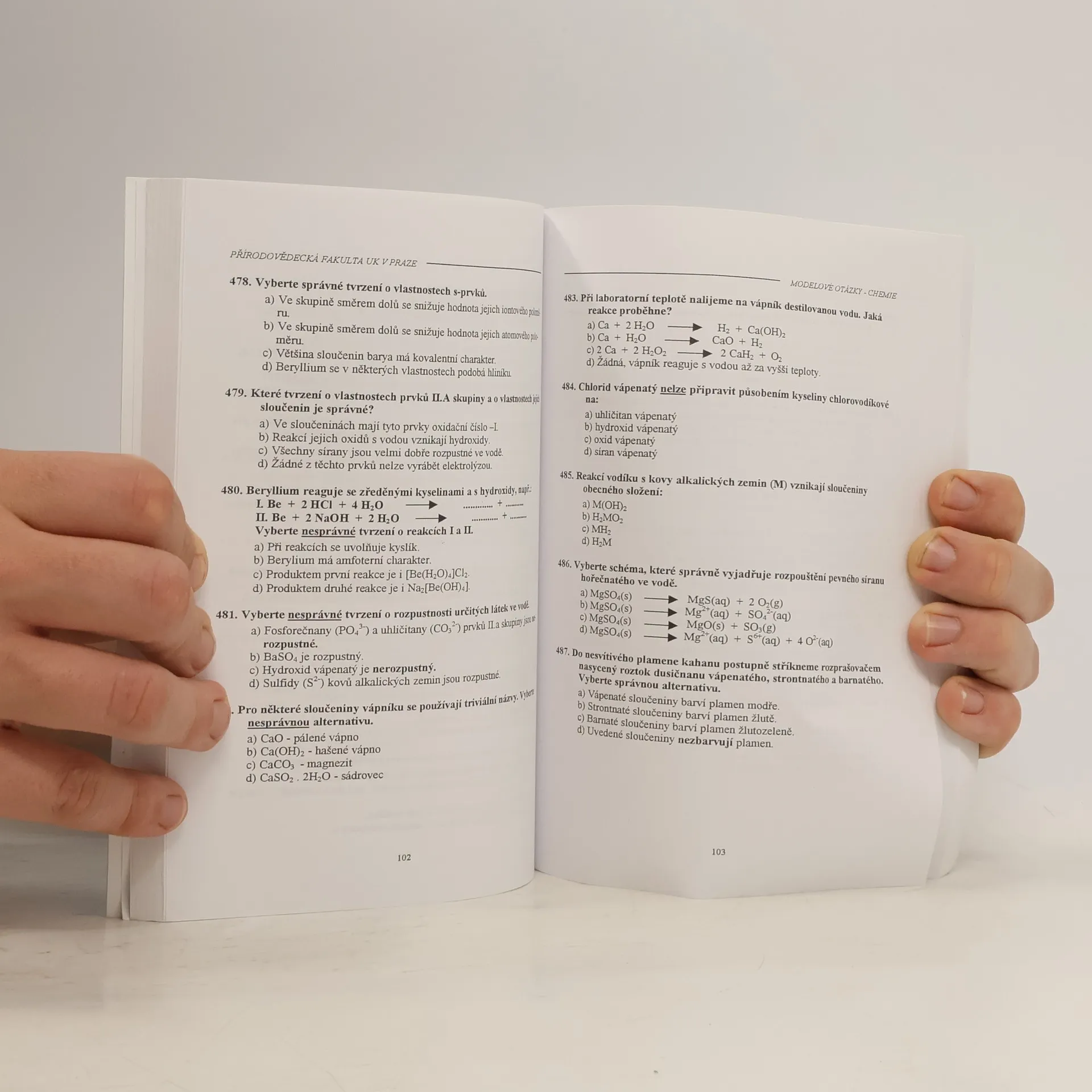 Publikace určená zájemcům o studium na Přírodovědecké fakultě Univerzity Karlovy v Praze. Přináší soubor 1016 testových úloh z chemie, které mají uchazečům usnadnit přípravu na přijímací zkoušku. V závěru jsou uvedeny správné odpovědi.