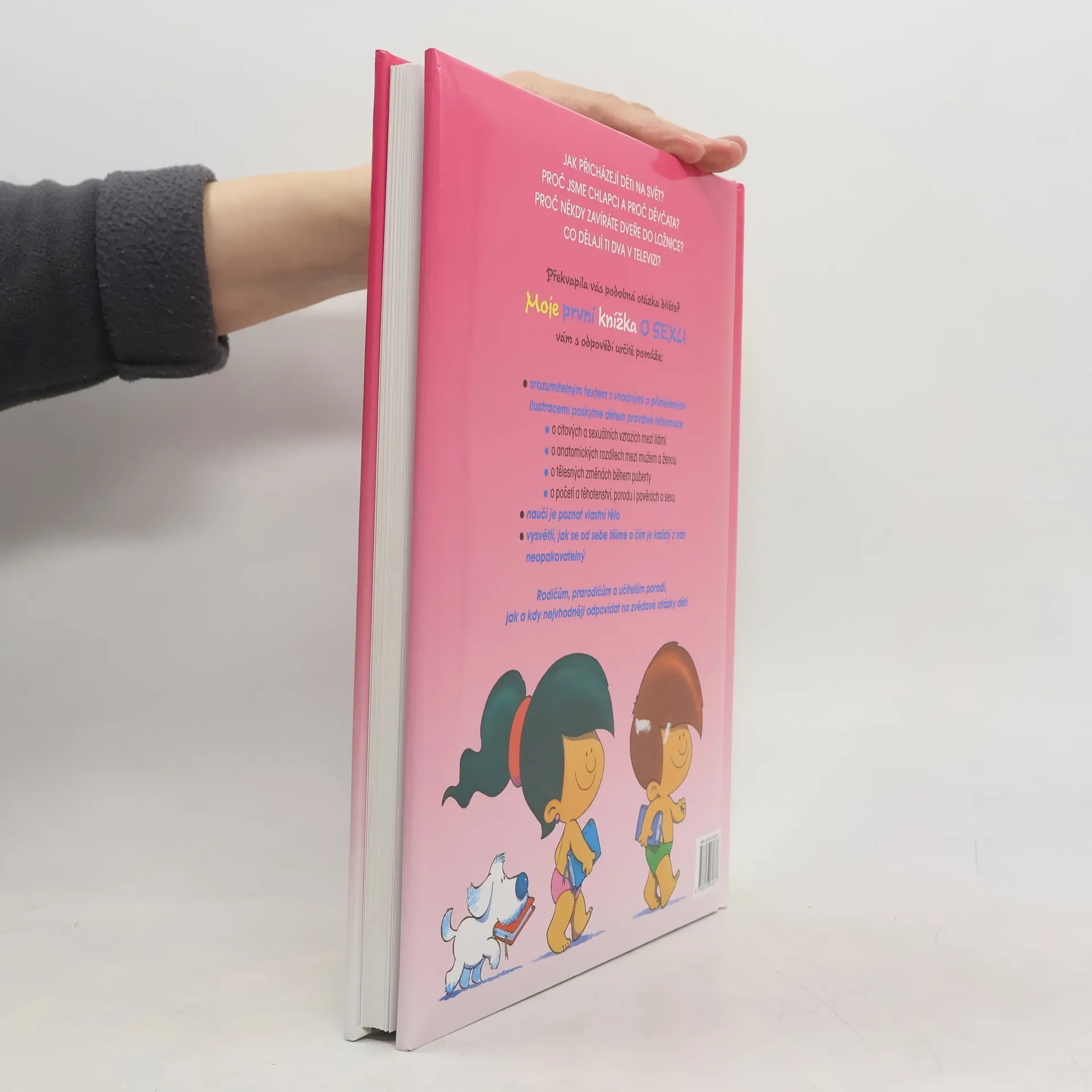 Jak přicházejí děti na svět? Proč jsme chlapci a proč děvčata? Proč někdy zavíráte dveře do ložnice? Co dělají ti dva v televizi? Překvapila vás podobná otázka dítěte? Moje první knížka o sexu vám s odpovědmi určitě pomůže: Srozumitelným textem s vhodnými a přiměřenými ilustracemi poskytne dětem pravdivé informace o citových sexuálních vztazích mezi lidmi, o anatomických rozdílech mezi mužem a ženou, o tělesných změnách během puberty, o početí a těhotenství, porodu i pověrách o sexu. Naučí je poznat vlastní tělo. Vysvětlí, jak se od sebe lišíme a čím je každý z nás neopakovatelný. Rodičům, prarodičům a učitelům poradí, lak a kdy nejvhodněji odpovídat na zvědavé otázky dětí.