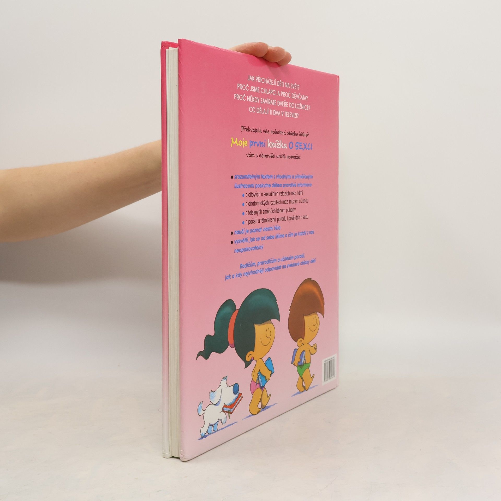 Jak přicházejí děti na svět? Proč jsme chlapci a proč děvčata? Proč někdy zavíráte dveře do ložnice? Co dělají ti dva v televizi? Překvapila vás podobná otázka dítěte? Moje první knížka o sexu vám s odpovědmi určitě pomůže: Srozumitelným textem s vhodnými a přiměřenými ilustracemi poskytne dětem pravdivé informace o citových sexuálních vztazích mezi lidmi, o anatomických rozdílech mezi mužem a ženou, o tělesných změnách během puberty, o početí a těhotenství, porodu i pověrách o sexu. Naučí je poznat vlastní tělo. Vysvětlí, jak se od sebe lišíme a čím je každý z nás neopakovatelný. Rodičům, prarodičům a učitelům poradí, lak a kdy nejvhodněji odpovídat na zvědavé otázky dětí.