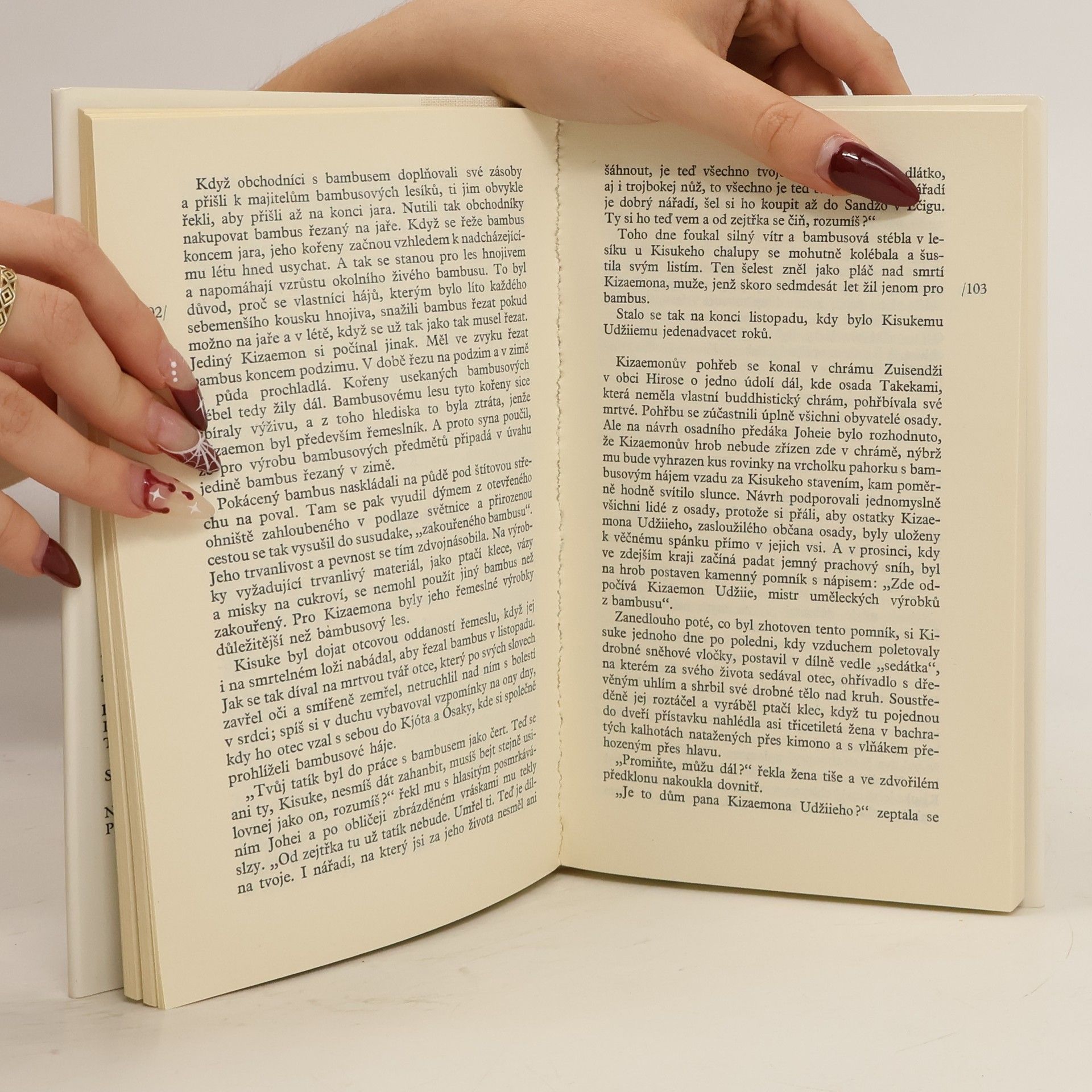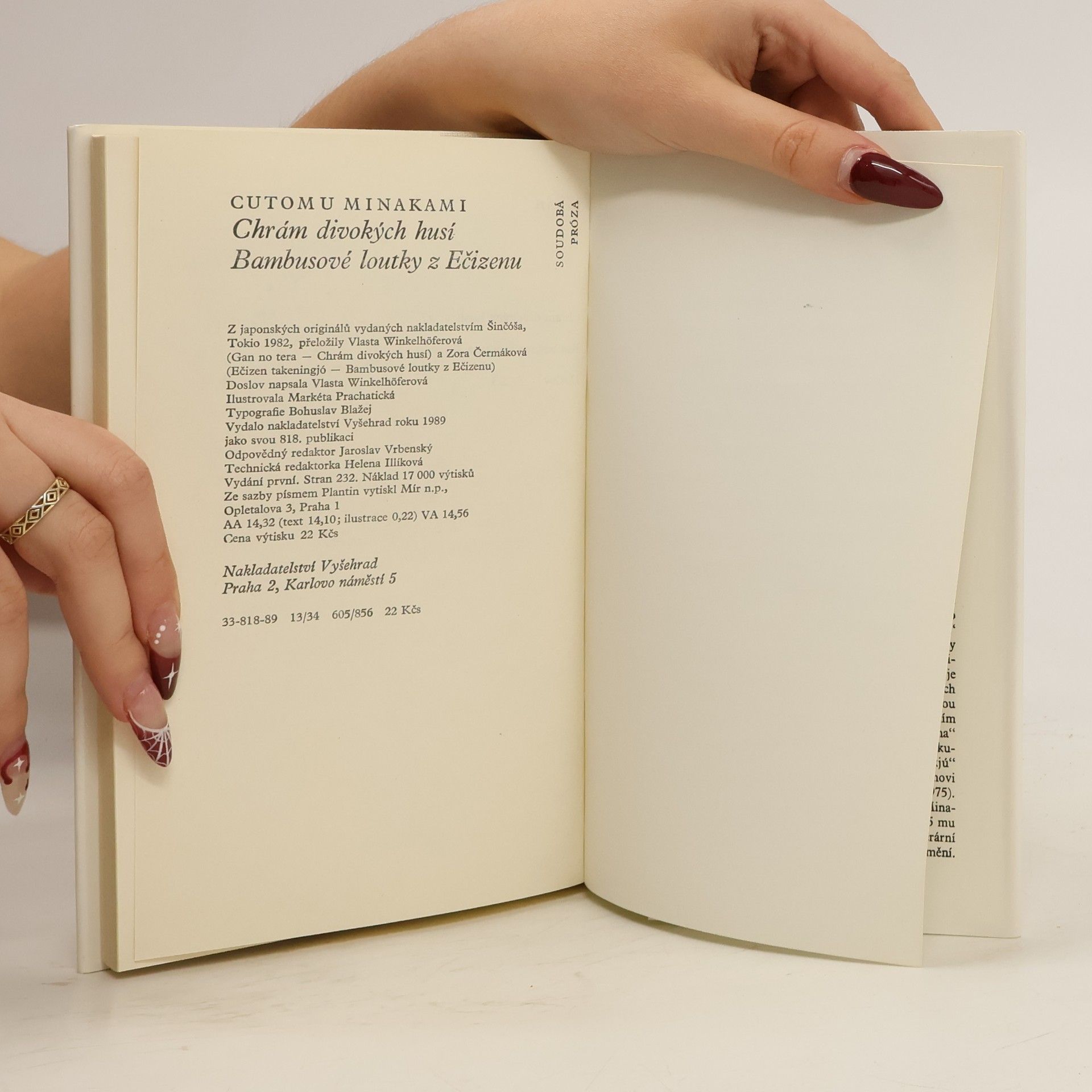 Dvě nejznámější prózy autora Cutomu Minakamiho nás zavádějí do typicky japonského prostředí a odehrávají se ve 20. a 30. letech 20. století. První („Chrám divokých husí“, 1961) je situována do zenového buddhistického chrámu Kohóan ležícího na úpatí hory Kinugasa v severozápadnímpředměstí starobylého Kjóta. Chrám má tři obyvatele – představeného, jeho družku a mladičkého novice Džinena, který je hlavní postavou „Chrámu divokých husí“. Pod zdánlivě klidným tokem života se v tomto místě odehrává drama, které nakonec vyústí v záhadné zmizení představeného. Stejně svěží vypravěčský styl, kterým si Minakami ve své zemi získával miliony čtenářů, je charakteristický i pro „Bambusové loutky z Ečizenu“ (1963), životní a milostný příběh nadaného lidového umělce za zapadlé osady v horské oblasti prefektury Fukui.