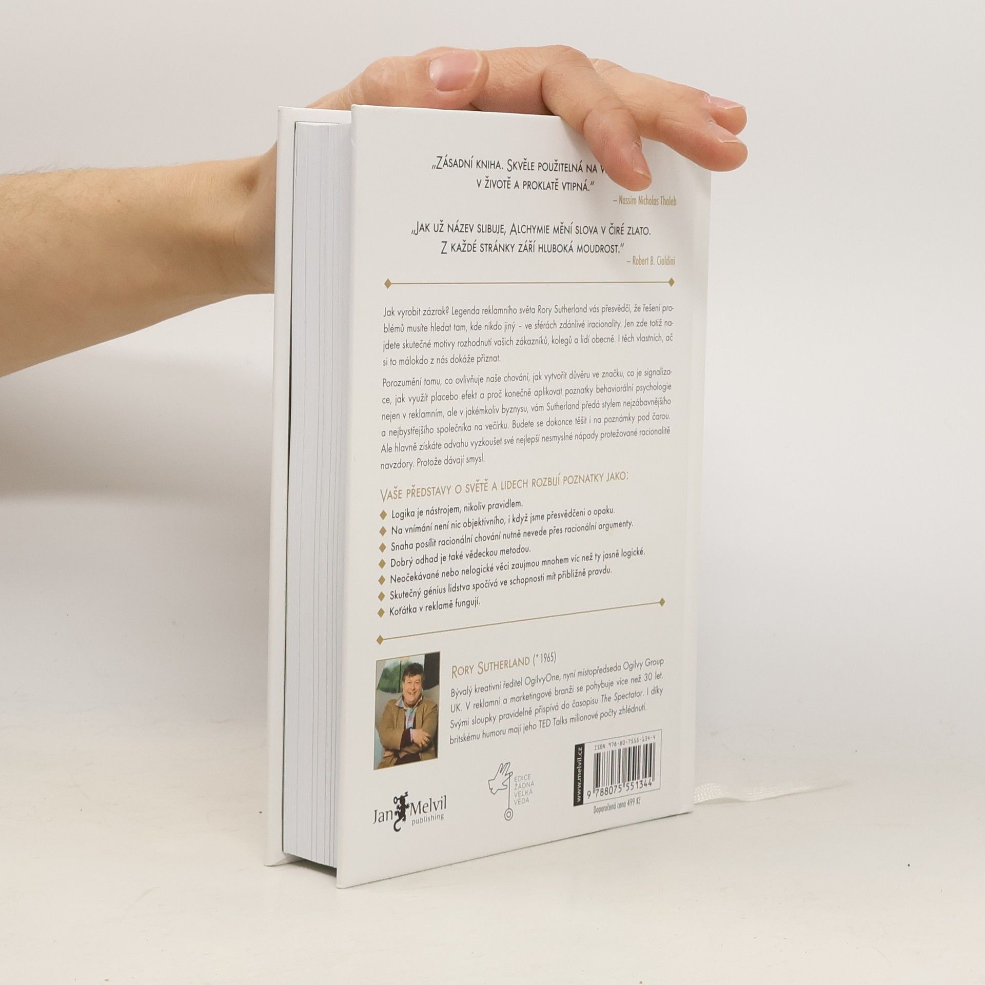 Jak vyrobit zázrak? Legenda reklamního světa Rory Sutherland vás přesvědčí, že řešení problémů musíte hledat tam, kde nikdo jiný – ve sférách zdánlivé iracionality. Jen zde totiž najdete skutečné motivy rozhodnutí vašich zákazníků, kolegů a lidí obecně. I těch vlastních, ač si to málokdo z nás dokáže přiznat. Porozumění tomu, co ovlivňuje naše chování, jak vytvořit důvěru ve značku, co je signalizace, jak využít placebo efekt a proč konečně aplikovat poznatky behaviorální psychologie nejen v reklamním, ale v jakémkoliv byznysu, vám Sutherland předá stylem nejzábavnějšího a nejbystřejšího společníka na večírku. Budete se dokonce těšit i na poznámky pod čarou. Ale hlavně získáte odvahu vyzkoušet své nejlepší nesmyslné nápady protěžované racionalitě navzdory. Protože dávají smysl. Vaše představy o světě a lidech rozbijí poznatky jako: - Logika je nástrojem, nikoliv pravidlem. - Na vnímání není nic objektivního, i když jsme přesvědčeni o opaku. - Snaha posílit racionální chování nutně nevede přes racionální argumenty. - Dobrý odhad je také vědeckou metodou. - Neočekávané nebo nelogické věci zaujmou mnohem víc než ty jasně logické. - Skutečný génius lidstva spočítá ve schopnosti mít přibližně pravdu. - Koťátka v reklamě fungují.