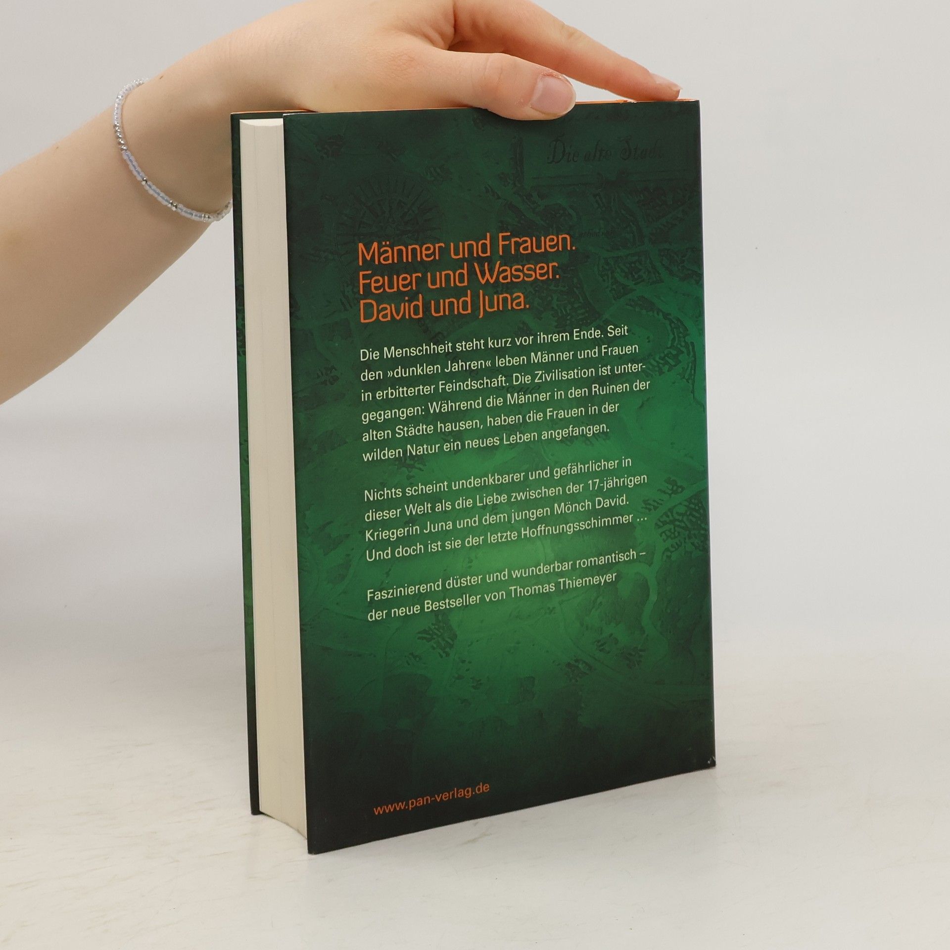 Männer und Frauen. Feuer und Wasser. David und Juna. Die Menschheit steht kurz vor ihrem Ende. Seit den »dunklen Jahren« leben Männer und Frauen in erbitterter Feindschaft. Die Zivilisation ist untergegangen: Während die Männer in den Ruinen der alten Städte hausen, haben die Frauen in der wilden Natur ein neues Leben angefangen. Nichts scheint undenkbarer und gefährlicher in dieser Welt als die Liebe zwischen der 17-jährigen Kriegerin Juna und dem jungen Mönch David. Und doch ist sie der letzte Hoffnungsschimmer … Faszinierend düster und wunderbar romantisch – der neue Bestseller von Thomas Thiemeyer