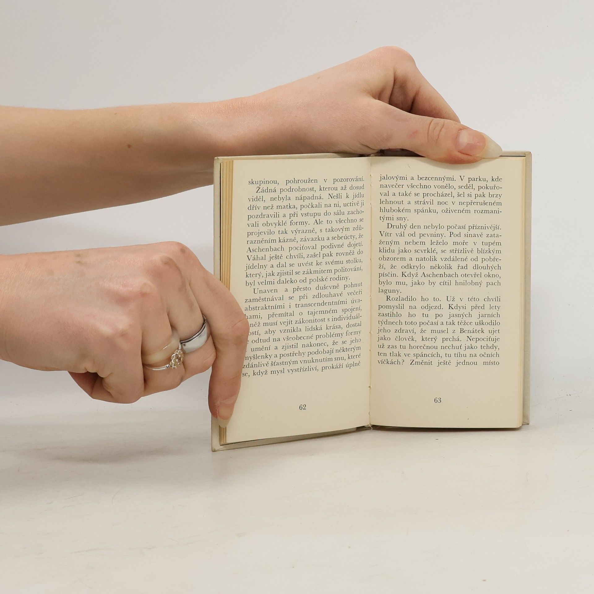 Novela z r. 1913, která eticky a esteticky končí jedno údobí autorova vývoje, řeší problém harmonie ducha a smyslů, krásy mravní a estetické. Stárnoucí spisovatel, který se ve svém díle dopracoval k vybroušené, avšak prázdné profesionální dokonalosti a který pěstuje umění odtržené od života, se na zájezdu do Benátek setkává s mladým chlapcem podmanivé svěžesti a toto setkání s kypícím životem vyvolá v něm tvůrčí krizi, jež přechází v jeho smrt duchovní i fyzickou.