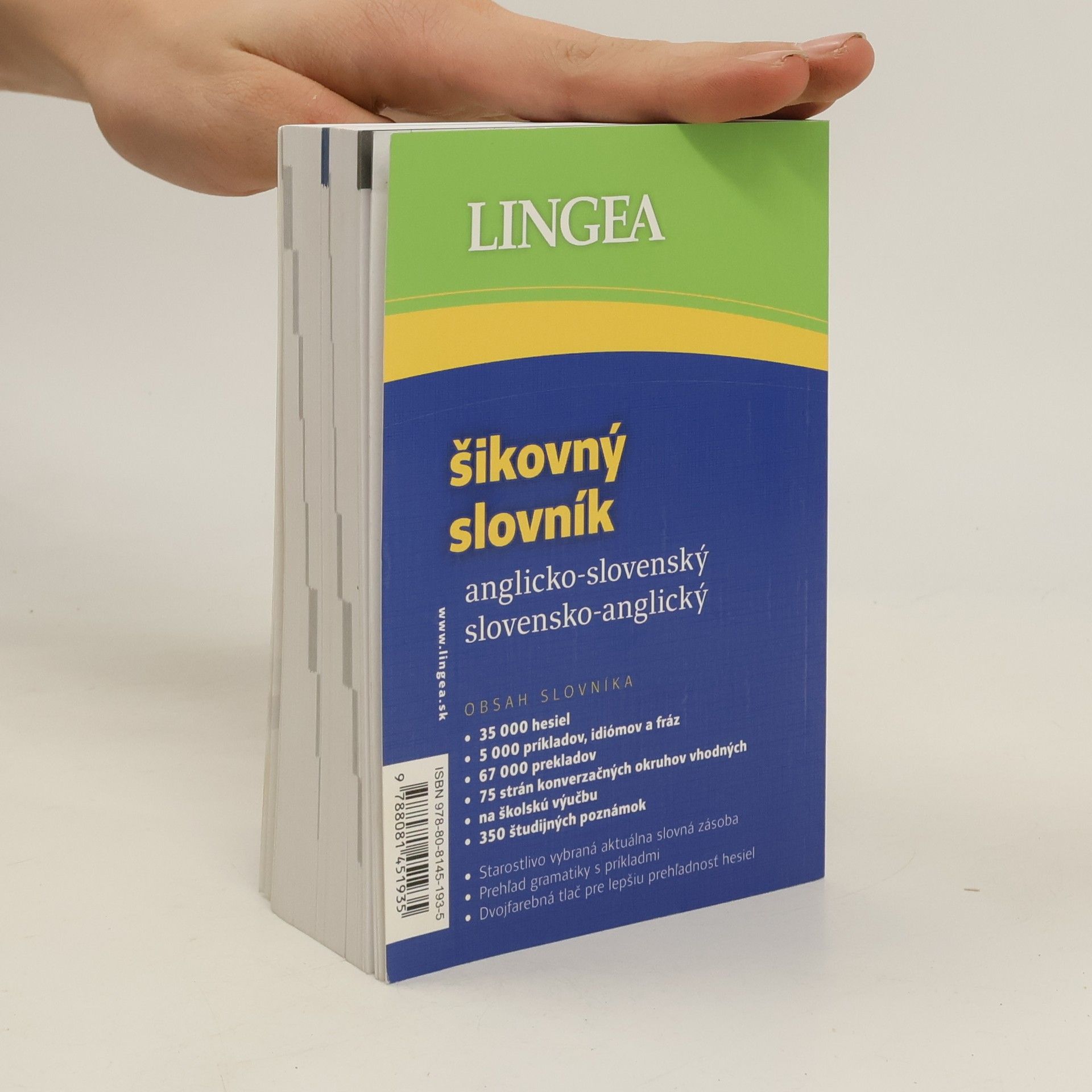 O B S A H U J E • 34 000 hesiel • 5 000 príkladov, idiómov a fráz • 66 000 prekladov • 75 strán konverzačných okruhov vhodných na školskú výučbu • 350 študijných poznámok • Starostlivo vybraná aktuálna slovná zásoba • Prehľad gramatiky s príkladmi • Dvojfarebná tlač pre lepšiu prehľadnosť hesiel