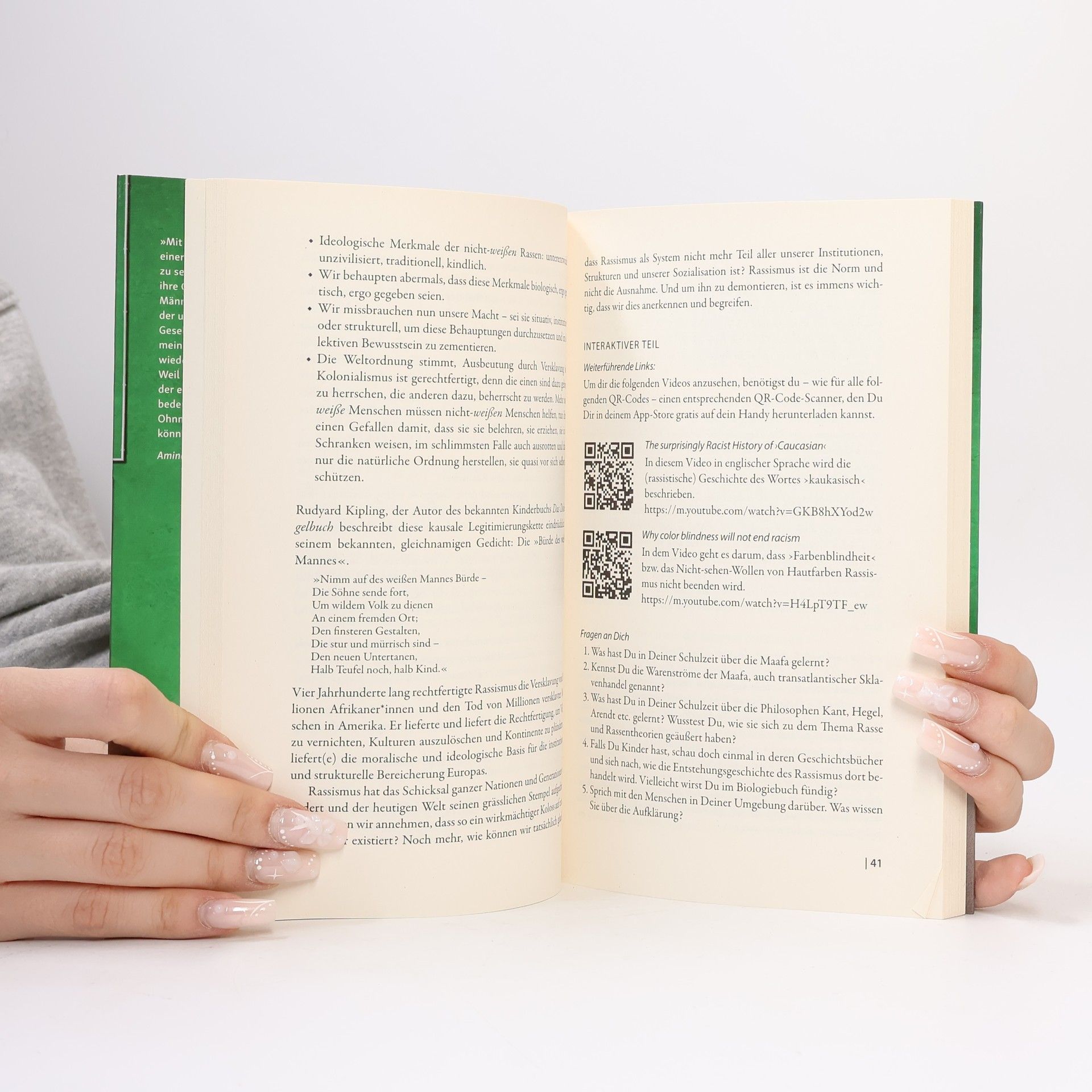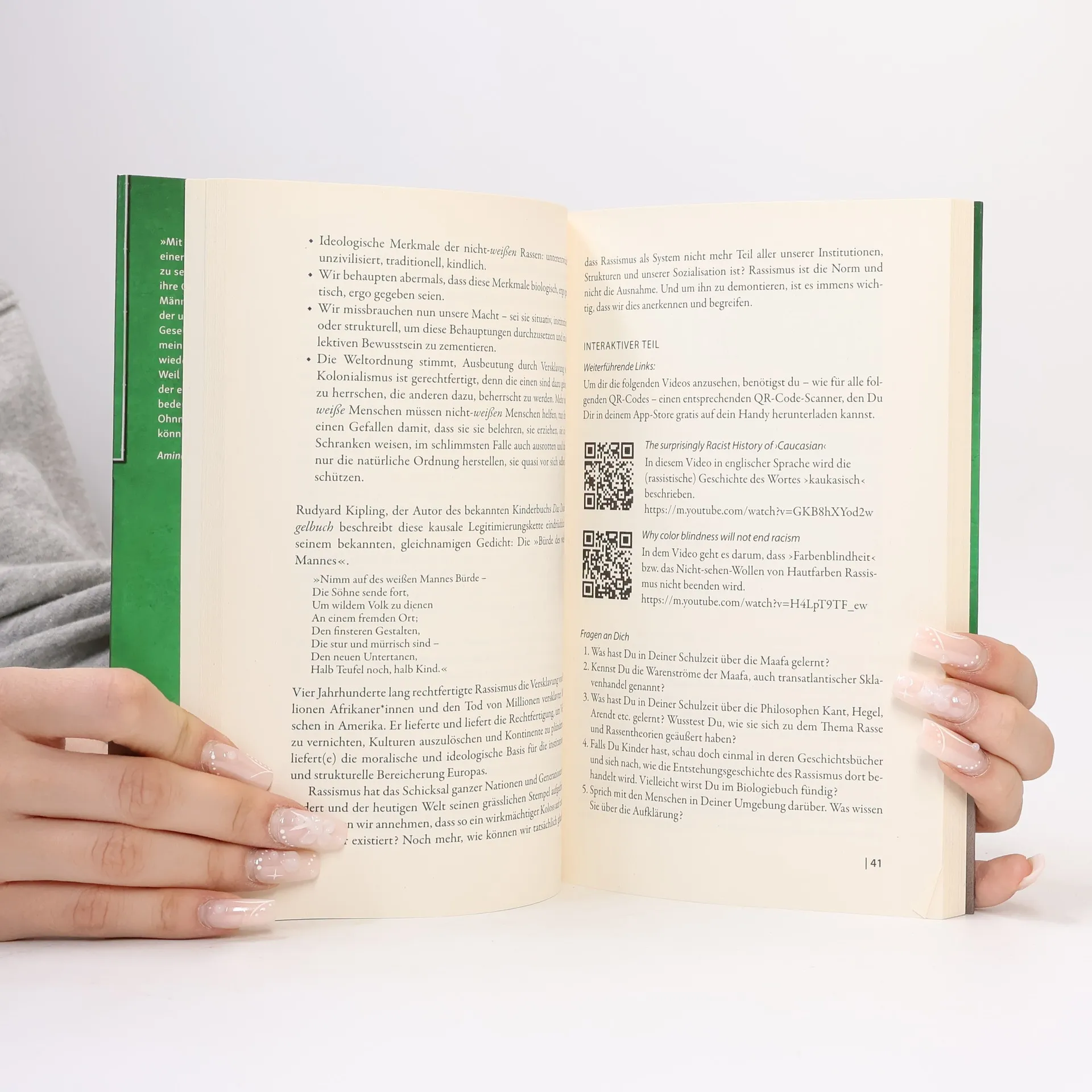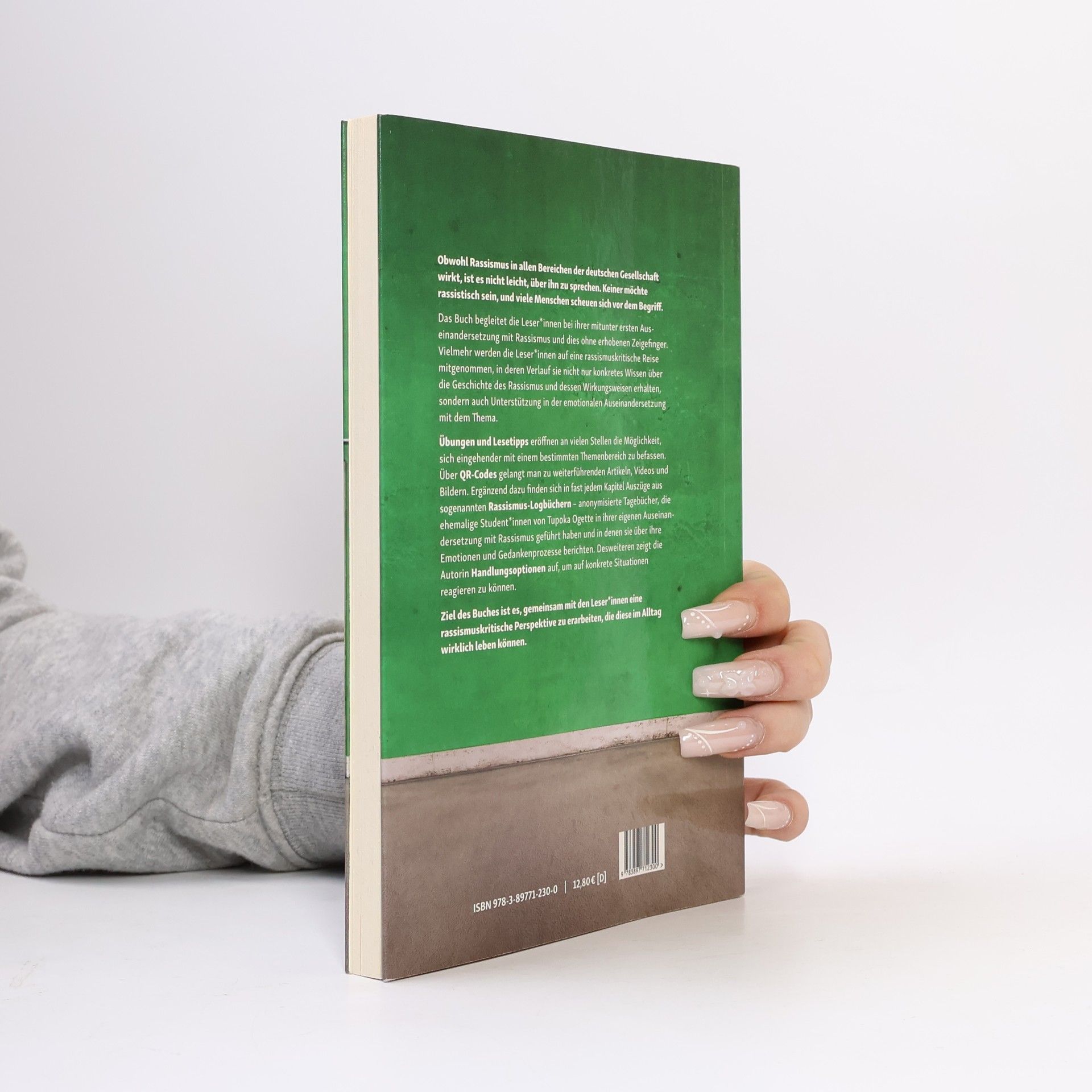 Obwohl Rassismus in allen Bereichen der deutschen Gesellschaft wirkt, ist es nicht leicht, über ihn zu sprechen. Keiner möchte rassistisch sein, und viele Menschen scheuen sich vor dem Begriff. Das Buch begleitet die Leser*innen bei ihrer mitunter ersten Auseinandersetzung mit Rassismus und tut dies ohne erhobenen Zeigefinger. Vielmehr werden die Leser*innen auf eine rassismuskritische Reise mitgenommen, in deren Verlauf sie nicht nur konkretes Wissen über die Geschichte des Rassismus und dessen Wirkungsweisen erhalten, sondern auch Unterstützung in der emotionalen Auseinandersetzung mit dem Thema. Übungen und Lesetipps eröffnen an vielen Stellen die Möglichkeit, sich eingehender mit einem bestimmten Themenbereich zu befassen. Über QR-Codes gelangt man zu weiterführenden Artikeln, Videos und Bildern. Ergänzend dazu finden sich in fast jedem Kapitel Auszüge aus sogenannten Rassismus-Logbüchern – anonymisierte Tagebücher, die ehemalige Student*innen von Tupoka Ogette in ihrer eigenen Auseinandersetzung mit Rassismus geführt haben und in denen sie über ihre Emotionen und Gedankenprozesse berichten. Auch Handlungsoptionen kommen nicht zu kurz. Ziel des Buches ist es, gemeinsam mit den Leser*innen eine rassismuskritische Perspektive zu erarbeiten, die diese im Alltag wirklich leben können.