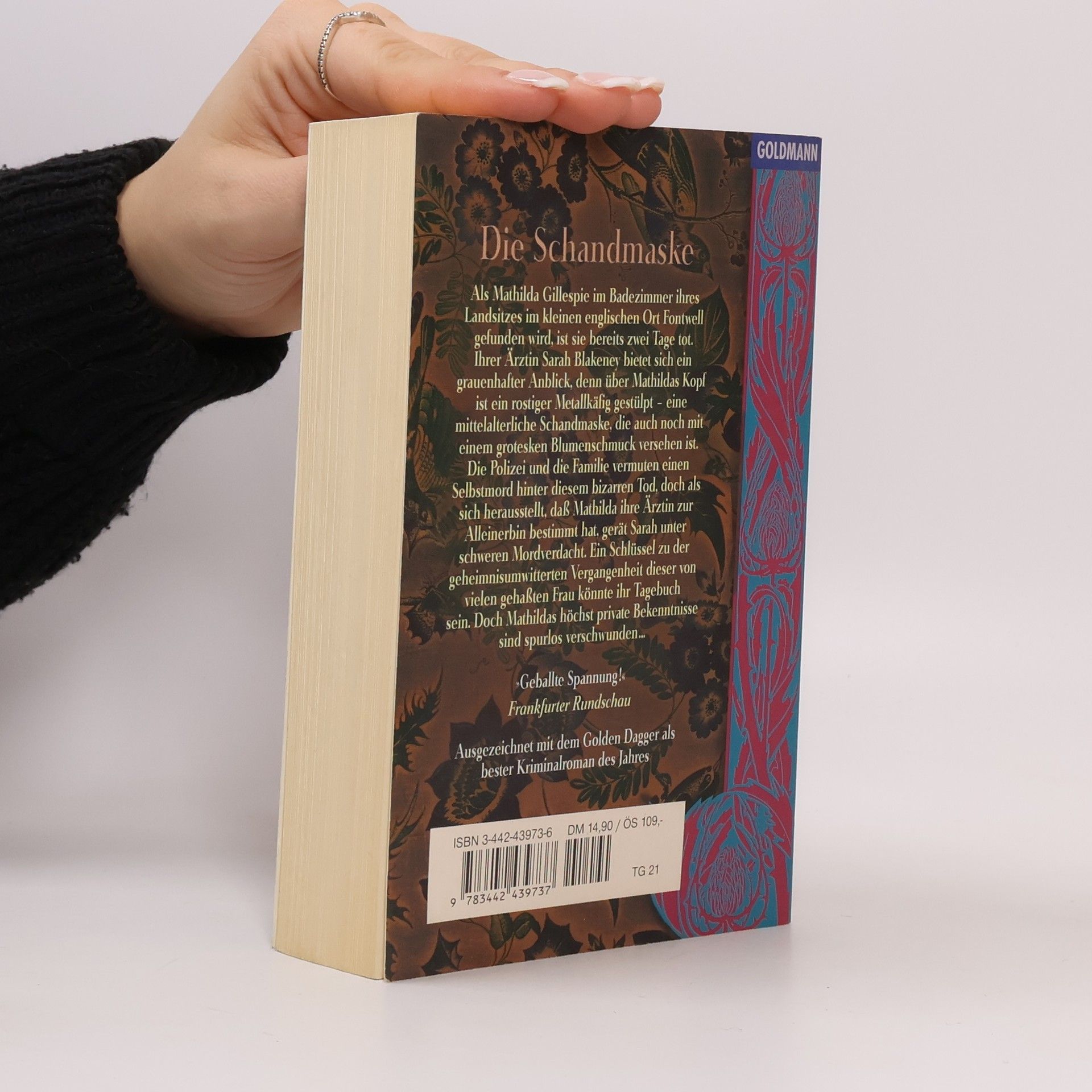 Der Spiegel-Bestseller jetzt erstmals im Taschenbuch: Die junge Ärztin Sarah Blakeney ist schockiert. als sie die Leiche von Mathilda Gillespie sieht, denn die Tote trägt eine makaber geschmückte mittelalterliche Schandmaske. Während Polizei und Familie von Selbstmord ausgehen, ist Sarah nicht bereit. diese Erklärung hinzunehmen. Doch dann stellt sich heraus, daß Mathilda sie zur Alleinerbin gemacht hat.
