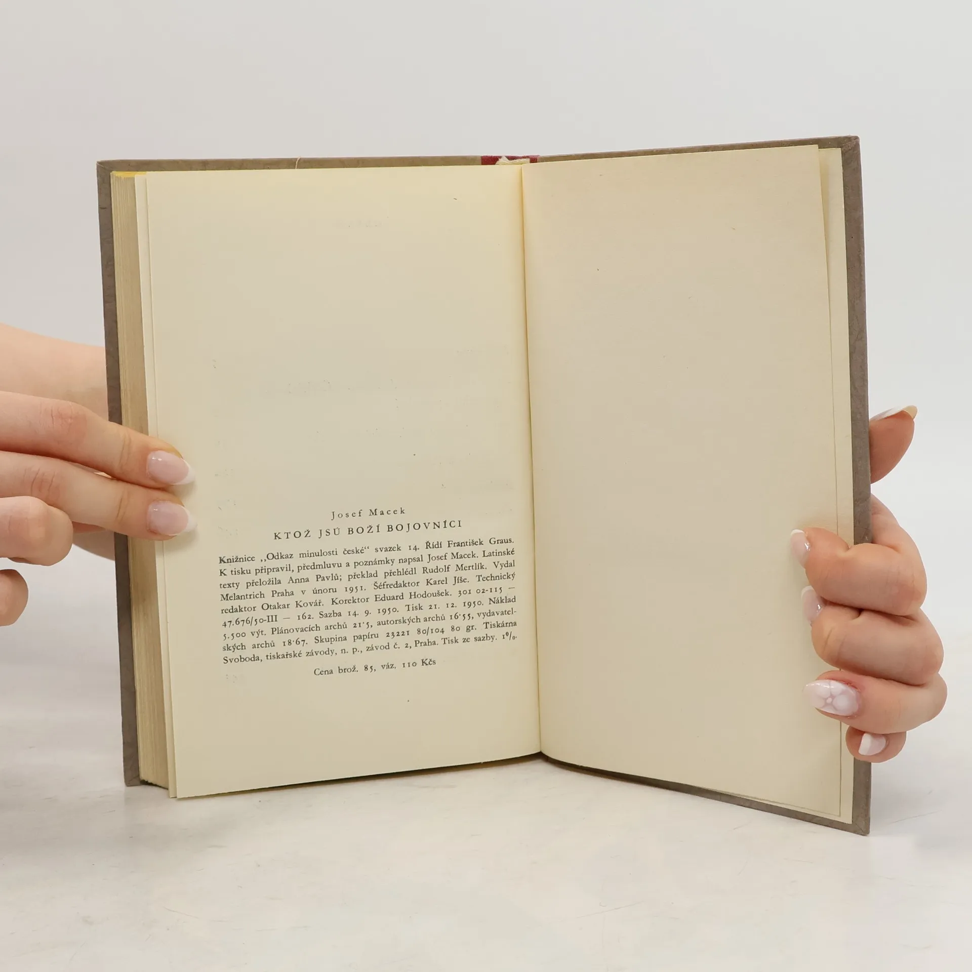 Ktož jsú boží bojovníci : čtení o Táboře v husitském revolučním hnutí. Výbor ukázek ze soudobých projevů, kronikářských zpráv, listů a jiných pramenů. Knížka má podobu montáže ukázek, proložených spojovacím textem, "... je určena všem, kdo se nespokojují výčtem a popisem vrcholné epochy našich dějin, nýbrž chtějí se dotknout a přímo cítit odkaz naší minulosti. Není tu na světlo vydáváno pro odborníka nic nového. Jen z nejrůznějších - leckdy nepřístupných, dávno rozebraných a i zapadlých - edic byla vybrána a přeložena hrst pramenů, splétajících se dohromady v živou představu Tábora. Zvláštní pozornost byla věnována dosud opomíjenému hospodářskému a sociálnímu pozadí tohoto vývoje, proto také traktátová, náboženská literatura ustupuje poměrně do pozadí." Výboru je předeslána úvodní kapitola o hospodářské a sociální situaci v Čechách na počátku 15. století. Snahou vydavatele bylo především, "aby čtenáři mohli v jedné knížce pohodlně sledovat nejdůležitější události, vojevůdce, politiky, kněze a vůbec život a vývoj na Táboře od bouřlivých počátků až k tragickému rozmezí lipanskému". Sestavil, k tisku připravil, předmluvu a poznámky napsal Josef Macek. Latinské texty přeložila Anna Pavlů.