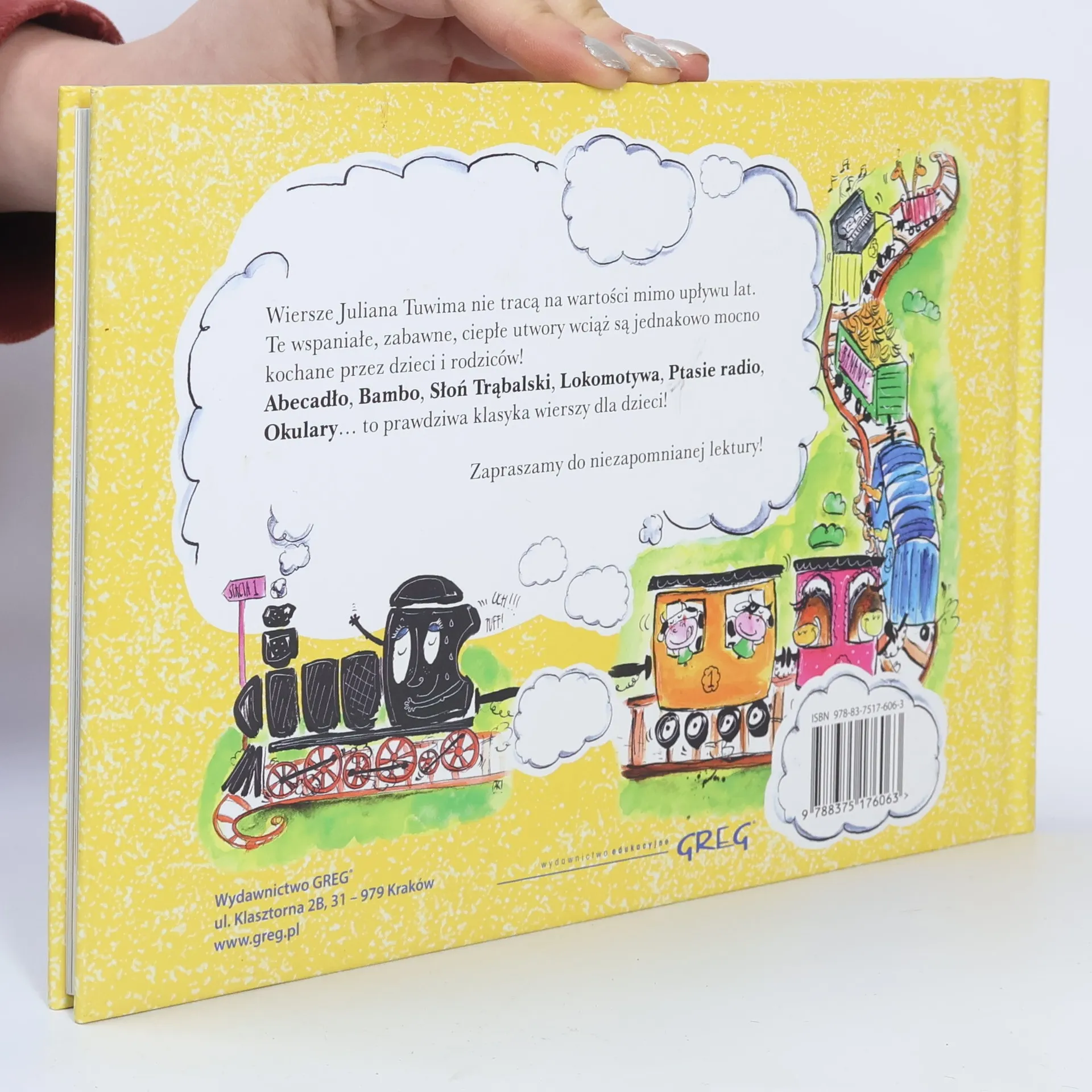 Najlepsza i najbardziej oryginalna edycja ponadczasowych wierszy dla dzieci Juliana Tuwima!Utwor�w Juliana Tuwima nie trzeba nikomu przedstawiać - każdy zna takie wiersze, jak Lokomotywa, Słoń Trąbalski, Sp�źniony słowik czy Rzepka, a także wiele, wiele innych. Wszystkie te kochane przez czytelnik�w utwory prezentujemy w nowym, ekskluzywnym wydaniu - w ciekawym poziomym formacie, ze wspaniałymi, niezwykle barwnymi i zabawnymi ilustracjami utalentowanej graficzki Agaty Krzyżanowskiej, z uszlachetnioną złotymi dodatkami, przepiękną okładką.Każda strona książki to prawdziwa uczta dla oka, a wspaniałe teksty autora zachwycą każde dziecko i rozbudzą miłość do literatury! Klasyka wierszy dla dzieci to pozycja absolutnie niezbędna w każdej dziecięcej biblioteczce!